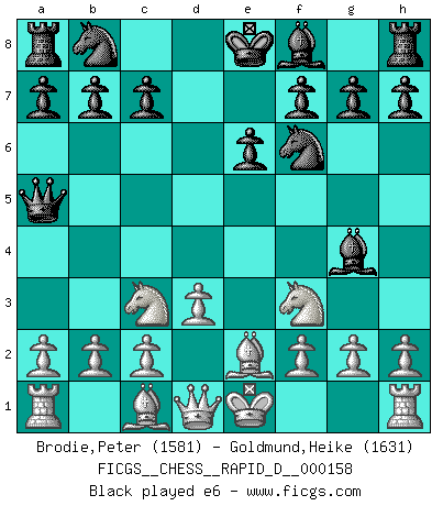 Last move : 0-1 2025 September 6 20:10:10 [Event "FICGS__CHESS__RAPID_D__000158"] [Site "FICGS"] [Date "2025.06.16"] [Round "1"] [White "Brodie,Peter"] [Black "Goldmund,Heike"] [Result "0-1"] [WhiteElo "1581"] [BlackElo "1631"] 1.e4 d5 2.exd5 Qxd5 3.Nc3 Qa5 4.Nf3 Nf6 5.d3 Bg4 6.Be2 e6 7.O-O c6 8.Bd2 Qc7 9.h3 Bf5 10.g4 Bg6 11.Qc1 Bd6 12.Kg2 Nbd7 13.g5 Nh5 14.Qd1 Nf4+ 15.Bxf4 Bxf4 16.Ne4 O-O 17.Rh1 Rad8 18.b4 Nb6 19.c4 Bxe4 20.Qb3 Bxf3+ 21.Bxf3 Bxg5 22.c5 Nd5 23.Bxd5 Rxd5 24.Rad1 Qf4 25.Rhe1 Bh4 26.Re2 Rg5+ 27.Kh1 Qf3+ 0-1 Follow this game move after move (download)I like to say that Bobby Fischer was the greatest player ever. But what made Fischer a genius was his ability to blend an American freshness and pragmatism with Russian ideas about strategy. (Bruce Pandolfini) Gott hat gewollt, dass ich Champion werde. (Surab Azmajparaschvili) Aquellos que dicen entender al Ajedrez, no entienden nada. (Robert Hubner) Il s'avisa de me proposer d'apprendre les échecs qu'il jouait un peu... me voilà forcené des échecs. J'achète un échiquier, je m'enferme dans ma chambre, j'y passe des jours et des nuits à vouloir apprendre par cur toutes les parties. (Jean-Jacques Rousseau, Confessions) Happy endings are just stories that haven't finished yet. (Jane Smith in Mr & Mrs Smith)