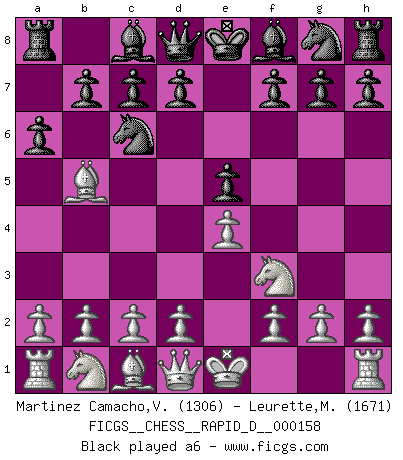 Last move : 0-1 2025 August 28 15:46:1 [Event "FICGS__CHESS__RAPID_D__000158"] [Site "FICGS"] [Date "2025.06.16"] [Round "1"] [White "Martinez Camacho,Victor Hugo"] [Black "Leurette,Marc-Antoine"] [Result "0-1"] [WhiteElo "1306"] [BlackElo "1671"] 1.e4 e5 2.Nf3 Nc6 3.Bb5 a6 4.Ba4 b5 5.Bb3 Nf6 6.d3 d5 7.exd5 Nxd5 8.O-O Be6 9.Re1 Bd6 10.Bd2 O-O 11.Nc3 Nxc3 12.Bxc3 Bxb3 13.axb3 b4 14.Bd2 a5 15.d4 exd4 16.c3 dxc3 17.bxc3 bxc3 18.Bxc3 Bb4 19.Bxb4 Nxb4 20.Qxd8 Rfxd8 21.h3 Nc2 22.Rec1 Nxa1 23.Rxa1 f6 24.Ra2 Rdc8 25.Nd4 c5 26.Nc2 Kf7 27.Na3 a4 28.Nc4 Rcb8 29.bxa4 Rb4 30.Nd6+ Ke6 31.Nb5 Kd5 32.Nc3+ Kc4 0-1 This chess game has been lost on time (started : 2025.06.16 12:7:13) Follow this game move after move (download)I love all positions. Give me a difficult positional game, I will play it. But totally won positions, I cannot stand them. (Hein Donner) Es macht mich traurig, wenn ich sehe, dass Golfprofis mehr verdienen als Schachsportler. Obwohl ich davon überzeugt bin, dass wir Schachspieler viel härter trainieren müssen als die Golfer. (Alexandra Kosteniuk) ¿Quién es tu oponente esta tarde? Esta tarde mi oponente son las piezas negras. (Akiba Rubinstein) D'abord les bases : Jouez et étudiez, puis étudiez et jouez, ensuite jouez et étudiez, puis étudiez et jouez. Deuxièmement : Donnez toujours le meilleur de vous-même ! (Ken Smith) When you don't know what to do, walk fast and look worried. (Anonymous)