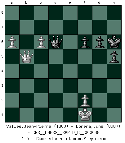 Last move : 1-0 2007 November 21 3:54:29 [Event "FICGS__CHESS__RAPID_C__000038"] [Site "FICGS"] [Date "2007.10.03"] [Round "1"] [White "Vallee,Jean-Pierre"] [Black "Lorena,June"] [Result "1-0"] [WhiteElo "1300"] [BlackElo "0987"] 1.e4 c5 2.d4 Nf6 3.d5 d6 4.Bc4 Nxe4 5.Nf3 g6 6.Bf4 Bg7 7.c3 O-O 8.Nbd2 Nxd2 9.Qxd2 a6 10.O-O b5 11.Bd3 Bg4 12.Qe3 Nd7 13.c4 Bxb2 14.Rab1 Bg7 15.Bh6 Bxf3 16.Bxg7 Bxg2 17.Bxf8 Bxf1 18.Bxe7 Qe8 19.Kxf1 Ne5 20.Bxd6 f6 21.cxb5 Rd8 22.Qxc5 Nxd3 23.Qd4 axb5 24.Qxd3 Rxd6 25.Rxb5 Qe5 26.a4 Qxh2 27.a5 Ra6 28.Rc5 Qd6 29.Qc4 h5 30.Qb5 Kg7 31.Rc6 Rxc6 32.dxc6 Kh6 33.a6 1-0 Sicilian : Smith-Morra gambit Kingside Castling by player Black (move 7) Kingside Castling by player White (move 10) 10 pieces endgame at move 32 : White KQPPP , Black KQPPP WHITE : King + 1 Queen 3 Pawns BLACK : King + 1 Queen 3 Pawns Player White won this chess game. Follow this game move after move (download)He who fears an isolated Queen's Pawn should give up Chess. (Siegbert Tarrasch) Das Zentrum ist der Balkan des Schachbretts - Kriegshandlungen können in jedem Moment ausbrechen. (Aaron Nimzowitsch) La vida es como el Ajedrez, con lucha, competición y eventos buenos y malos. (Benjamin Franklin) Le moment que je préfère le plus dans une rencontre, c'est celui où je sens que la personnalité de l'adversaire se brise. (Robert Fischer) Think like a man of action, act like a man of thought. (Henri Louis Bergson)