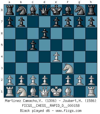 Last move : 1-0 2025 August 22 13:27:55 [Event "FICGS__CHESS__RAPID_D__000158"] [Site "FICGS"] [Date "2025.06.16"] [Round "1"] [White "Martinez Camacho,Victor Hugo"] [Black "Joubert,Hennie"] [Result "1-0"] [WhiteElo "1306"] [BlackElo "1586"] 1.e4 c5 2.Nf3 d6 3.Bc4 Nc6 4.d3 e6 5.O-O Nf6 6.Bg5 Be7 7.Nc3 a6 8.a3 O-O 9.Re1 b5 10.Ba2 Bb7 11.h3 h6 12.Bh4 Qc7 13.Qd2 Rad8 14.Rad1 Nd4 15.Nxd4 cxd4 16.Ne2 e5 17.Bg3 Rc8 18.Rc1 Kh8 19.Bh2 Nd7 20.f4 f5 21.fxe5 dxe5 22.Nxd4 exd4 23.Bxc7 1-0 Follow this game move after move (download)The Chess pieces are the block alphabet which shapes thoughts; and these thoughts, although making a visual design on the chessboard, express their beauty abstractly, like a poem. (Marcel Duchamp) Aljechin war kein Nazi. Er war ein Opportunist. Ein schrecklicher Mann. Er liebte Geld über alles und würde für Geld ein Jude, ein Katolik oder ein Protestant werden. (Miguel Najdorf) Las piezas de Ajedrez son los bloques del alfabeto que moldean los pensamientos; y esos pensamientos, aunque hagan un diseño visual en el tablero, expresan abstractamente su belleza como un poema. (Marcel Duchamp) Les échecs, c'est la lutte contre l'erreur. (Johannes Zukertort) Life is verb, not a noun. (Charlotte Perkins Gilman)