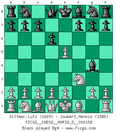 Last move : 0-1 2025 July 29 8:4:5 [Event "FICGS__CHESS__RAPID_D__000158"] [Site "FICGS"] [Date "2025.06.16"] [Round "1"] [White "Dittmer,Lutz"] [Black "Joubert,Hennie"] [Result "0-1"] [WhiteElo "1669"] [BlackElo "1586"] 1.f4 e5 2.fxe5 d6 3.Nf3 Bg4 4.h3 Bh5 5.e3 Nc6 6.Bd3 Nxe5 0-1 This chess game has been lost on time (started : 2025.06.16 12:7:13) Follow this game move after move (download)I still hope to kill Fischer. (Boris Spassky) Es liegt in der Natur, vernüftig zu denken und unlogisch zu handeln. (Anatole France) El Ajedrez es parte de una cultura y si una cultura esta en decadencia, entonces también el Ajedrez declinará. (Mikhail Botvinnik) Un millionnaire : 'Monsieur Steinitz ! Vous ne participez aux tournois que pour l'argent, alors que moi je n'y viens que pour l'honneur.' Steinitz : 'Chacun joue pour ce qu'il n'a pas'... Unless I accept my faults I will most certainly doubt my virtues. (Hugh Prather)