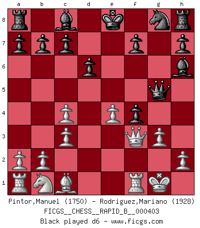 Last move : 0-1 2025 July 21 20:18:17 [Event "FICGS__CHESS__RAPID_B__000403"] [Site "FICGS"] [Date "2025.06.22"] [Round "1"] [White "Pintor,Manuel"] [Black "Rodriguez,Mariano"] [Result "0-1"] [WhiteElo "1750"] [BlackElo "1928"] 1.e4 e5 2.f4 exf4 3.Nf3 g5 4.Bc4 g4 5.O-O gxf3 6.Qxf3 Qf6 7.d3 Nc6 8.c3 Ne5 9.Qh5 Bh6 10.g3 Nxc4 11.dxc4 Qg5 12.Qf3 d6 13.Bxf4 Qc5+ 14.Kg2 Bxf4 15.Qxf4 Be6 16.Nd2 O-O-O 17.b3 Ne7 18.Nf3 Ng6 19.Qf6 Qh5 20.h4 Qg4 21.Rh1 Rhg8 22.Ng5 Ne5 23.Raf1 h6 24.Rf4 Qe2+ 25.Rf2 Qd3 26.Rhf1 hxg5 27.hxg5 Qxe4+ 28.Rf3 Bg4 29.Qf4 Bxf3+ 30.Rxf3 Qxf3+ 31.Qxf3 Nxf3 32.Kxf3 Rxg5 0-1 Follow this game move after move (download)Checkers is for tramps. (Paul Morphy) Als er Schachweltmeister wurde ließ er praktisch alle stärksten Sovietspieler für sich arbeiten. Wenn ein auch nur mittelmässiger Meister ein Spezialist für eine bestimmte Eröffnung war, wurde er von Karpov gerufen. Das wurde alles geheim gehalten. (Mikhail Moiseyevich Botvinik) El Ajedrez no es una pizca de inferior al violín, y tenemos un gran número de violinistas profesionales. (Mikhail Botvinnik) Des idées, des idées, j'en ai cent, j'en ai mille. Des bonnes, des mauvaises, applicables, irréalisables... Il suffit de faire le tri ! (Roos) If you know the enemy and know yourself you need not fear the results of a hundred battles. (Sun Tzu)