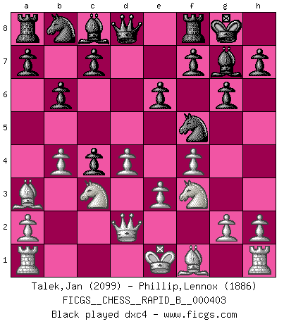Last move : 1/2-1/2 2025 October 1 23:48:29 [Event "FICGS__CHESS__RAPID_B__000403"] [Site "FICGS"] [Date "2025.06.22"] [Round "1"] [White "Talek,Jan"] [Black "Phillip,Lennox"] [Result "1/2-1/2"] [WhiteElo "2099"] [BlackElo "1886"] 1.f4 d5 2.Nf3 g6 3.e3 Bg7 4.c4 e6 5.Nc3 Ne7 6.b4 O-O 7.d4 b6 8.Ba3 Nf5 9.Qd2 dxc4 10.Bxc4 Qe7 11.Qc1 Bb7 12.O-O Rc8 13.Be2 Nd7 14.Rb1 Qe8 15.Rd1 Nf6 16.Ne5 a6 17.Bd3 Nd6 18.Qc2 Nd5 19.Nxd5 exd5 20.f5 f6 21.Ng4 g5 22.Nf2 Qf7 23.Rf1 Re8 24.Bc1 Bf8 25.Rb3 Kh8 26.Rc3 Rac8 27.Rb3 Qd7 28.Ng4 Qg7 29.Nf2 g4 30.Bd2 h5 31.Be2 Nc4 32.Bc1 c5 33.bxc5 bxc5 34.Bxc4 dxc4 35.Qxc4 Qd7 36.Rb6 Bd5 37.Qd3 c4 38.Qc3 Rc6 39.Rb2 Qxf5 40.Nh3 Qd3 41.Qa5 Rc5 42.dxc5 gxh3 43.Qd2 Bxc5 44.Qxd3 cxd3 45.Rxf6 Rxe3 46.Bxe3 Bxe3+ 47.R6f2 hxg2 48.Rb8+ Kg7 49.Rd8 Bxf2+ 50.Kxf2 Bxa2 51.Rxd3 a5 52.Kxg2 a4 53.Rd6 Bc4 54.Rd7+ Kf6 55.Ra7 Bb3 56.Ra5 Ke6 57.Kf3 Kf6 58.Kf4 Bd1 59.Ra6+ Ke7 60.Ke5 Kf7 61.Kf5 Ke7 62.Ke5 Kf7 63.Rf6+ Ke7 64.Rb6 Kf7 65.Kf5 Ke7 66.Kg5 Bf3 67.Rf6 Bd1 68.Rc6 Bb3 69.Ra6 Bd1 70.Rc6 Bb3 71.Kxh5 a3 72.Kg5 a2 73.Ra6 Bc4 74.Ra7+ Kf8 75.h4 Bd5 76.h5 Kg8 77.h6 Kh8 78.Kf6 Bb3 79.h7 a1Q+ 1/2-1/2 Follow this game move after move (download)Chess, like love, like music, has the power to make people happy. (Siegbert Tarrasch) Ich liebe den Moment, wenn ich das Ego meines Gegenüber breche. (Robert James Fischer) El Ajedrez es imaginación. (David Bronstein) Les échecs, c'est l'art d'analyser. (Mikhail Botvinnik) As a goal marker shodan is important. As a destination it is a poor place to stop. (Thomas Tamayo)