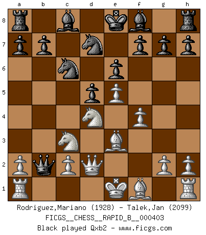 Last move : 1/2-1/2 2025 August 3 22:12:23 [Event "FICGS__CHESS__RAPID_B__000403"] [Site "FICGS"] [Date "2025.06.22"] [Round "1"] [White "Rodriguez,Mariano"] [Black "Talek,Jan"] [Result "1/2-1/2"] [WhiteElo "1928"] [BlackElo "2099"] 1.e4 e6 2.d4 d5 3.Nc3 Nf6 4.e5 Nfd7 5.f4 c5 6.Nf3 Nc6 7.Be3 cxd4 8.Nxd4 Qb6 9.Qd2 Qxb2 10.Rb1 Qa3 11.Bb5 Nxd4 12.Bxd4 a6 13.Bxd7+ Bxd7 14.Rb3 Qe7 15.Rxb7 Qd8 16.O-O Qc8 17.Rfb1 Bc5 18.f5 Bxd4+ 19.Qxd4 Bb5 20.Rb6 O-O 21.a4 Qc4 22.Nxb5 axb5 23.Qxc4 bxc4 24.fxe6 fxe6 25.Ra1 Ra5 26.Rxe6 Rfa8 27.Rd6 Rxa4 28.Rxa4 Rxa4 29.Rxd5 Ra2 30.e6 Kf8 31.Rd2 Ke7 32.Re2 Ra1+ 33.Kf2 Rd1 34.Kf3 1/2-1/2 Follow this game move after move (download)Chess is as much a mystery as women. (Purdy) Eine Person mit durchschnittlichem IQ kann etwa eine ELO von 2000 erreichen. (Jonathan Levitt) Siempre es mejor sacrificar los hombres de tu oponente. (Savielly Tartakower) Pour moi, les échecs ne sont pas un jeu mais un art. (Alexandre Alekhine) Every vice is only an exaggeration of a necessary and virtuous function. (Ralph Waldo Emerson, Journals 1936)