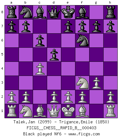 Last move : 1-0 2025 August 7 0:13:57 [Event "FICGS__CHESS__RAPID_B__000403"] [Site "FICGS"] [Date "2025.06.22"] [Round "1"] [White "Talek,Jan"] [Black "Trigance,Emile"] [Result "1-0"] [WhiteElo "2099"] [BlackElo "1850"] 1.g3 d5 2.Nf3 c6 3.c4 Nf6 4.Bg2 e6 5.d4 dxc4 6.Ne5 Nbd7 7.Nxc4 Be7 8.O-O O-O 9.a4 b5 10.axb5 1-0 This chess game has been lost on time (started : 2025.06.22 17:37:45) Follow this game move after move (download)Even the laziest King flees wildly in the face of a double check ! (Aaron Nimzowitsch) Strategie ist, wie man ein Mädchen auf den Rücksitz bekommt. Taktik ist, was man tut, wenn man dann dort ist. (Anonymous) Nunca nadie ha ganado una partida de Ajedrez rindiendose. (Unknown) Les sacrifices démontrent seulement que quelqu'un a gaffé. (Savielly Tartacover) War is the child of passion, passion is the child of narcissism and narcissism is the child. (...) Another game ? (Thibault de Vassal)