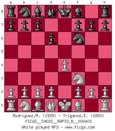 Last move : 1-0 2025 July 31 5:49:2 [Event "FICGS__CHESS__RAPID_B__000403"] [Site "FICGS"] [Date "2025.06.22"] [Round "1"] [White "Rodriguez,Mariano"] [Black "Trigance,Emile"] [Result "1-0"] [WhiteElo "1928"] [BlackElo "1850"] 1.e4 e5 2.Nf3 Nf6 3.Nxe5 d6 4.Nf3 Nxe4 5.d4 d5 6.Bd3 1-0 This chess game has been lost on time (started : 2025.06.22 17:37:45) Follow this game move after move (download)Chess is imagination. (David Bronstein) Das Spiel gibt uns die Genugtuung, die das Leben uns versagt. (Emanuel Lasker) No es tiempo de jugar al Ajedrez cuando la casa esta en llamas. (Proverbio Italiano) Aucun coup ne doit être joué sans but. (Pedro Damiano) A cynic is a man who knows the price of everything but the value of nothing. (Oscar Wilde)