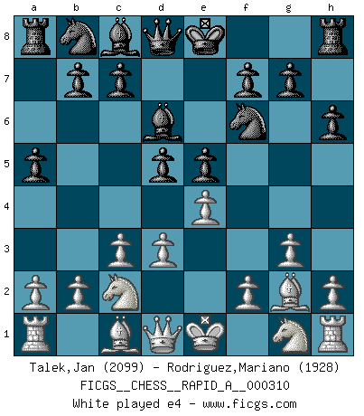 Last move : 1/2-1/2 2025 October 8 0:27:18 [Event "FICGS__CHESS__RAPID_A__000310"] [Site "FICGS"] [Date "2025.06.25"] [Round "1"] [White "Talek,Jan"] [Black "Rodriguez,Mariano"] [Result "1/2-1/2"] [WhiteElo "2099"] [BlackElo "1928"] 1.Na3 e5 2.c3 d5 3.Nc2 Bd6 4.g3 h6 5.Bg2 Nf6 6.d3 a5 7.e4 dxe4 8.dxe4 O-O 9.Nh3 Qe7 10.O-O a4 11.f3 Nc6 12.Qe2 Na5 13.Nf2 Rd8 14.Ne3 Bc5 15.Re1 Be6 16.Bf1 Qe8 17.Kh1 Nc4 18.Bh3 b5 19.Bxe6 Qxe6 20.Kg2 Ra6 21.Rd1 Rad6 22.Rd3 Rxd3 23.Nxd3 Bb6 24.Nb4 Bxe3 25.Bxe3 Nxe3+ 26.Qxe3 Rd6 27.Rf1 Nh7 28.h4 g5 29.Kh2 c6 30.Rg1 g4 31.f4 Nf6 32.Re1 Nd7 33.Kg2 Qc4 34.h5 Kf8 35.Rf1 exf4 36.gxf4 Nc5 37.e5 Rd7 38.Kg1 g3 39.Kg2 Ne4 40.b3 Qxc3 41.Qxc3 Nxc3 42.bxa4 c5 43.Na6 Nxa4 44.Rc1 c4 45.Kxg3 Rd2 46.Kg4 Rxa2 47.Nc7 Rb2 48.Ra1 c3 49.Nxb5 Rxb5 50.Rxa4 Rc5 51.Ra1 Ke7 52.Kf3 Ke6 53.Ra6+ Ke7 54.Ra1 Ke6 55.Ra6+ Kd7 56.Ra1 Kc6 57.Ke4 c2 58.Rc1 Rc4+ 59.Kd3 Kd5 60.f5 Rd4+ 61.Ke3 Kxe5 62.Rxc2 Rh4 63.Rc5+ Kf6 64.Rc6+ Kg5 65.Rc7 f6 66.Kf2 Rh3 67.Rc8 Kg4 68.Kg2 Rxh5 69.Rc4+ Kxf5 70.Kg3 Rg5+ 71.Kh4 Rg1 72.Rc5+ Kg6 73.Ra5 Re1 74.Kg3 Re3+ 75.Kh4 Re4+ 76.Kg3 Re3+ 77.Kf4 Rc3 78.Ra8 h5 79.Rg8+ Kh6 1/2-1/2 Follow this game move after move (download)The winner of the game is the player who makes the next-to-last mistake. (Savielly Tartakover) Wie gewinnt Tal? Er entwickelt alle seine Figuren in die Brettmitte und opfert sie dann irgendwo. (Robert James Fischer) Tu sabes que vas a perder. Aún cuando tenía la ventaja, yo sabía que iba a perder. - al estar jugando con Fischer (Andrew Soltis) Celui qui prend des risques peut perdre, celui qui n'en prend pas perd toujours. (Xavier Tartacover) Even the best needles are not sharp at both ends. (Chinese proverb)