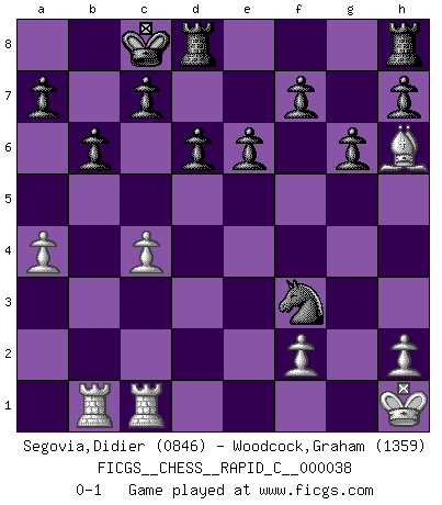 Last move : 0-1 2008 January 6 10:47:29 [Event "FICGS__CHESS__RAPID_C__000038"] [Site "FICGS"] [Date "2007.10.03"] [Round "1"] [White "Segovia,Didier"] [Black "Woodcock,Graham"] [Result "0-1"] [WhiteElo "0846"] [BlackElo "1359"] 1.e4 d6 2.d4 g6 3.Be2 Bg7 4.Nf3 b6 5.O-O Nf6 6.Nc3 Bb7 7.Bg5 Nxe4 8.d5 Bxc3 9.bxc3 Nxc3 10.Qd3 Nxe2+ 11.Qxe2 Bxd5 12.Bh6 Nc6 13.Qb5 e6 14.c4 Bxf3 15.gxf3 Qd7 16.a4 Ne5 17.Qxd7+ Nxd7 18.Rab1 Ne5 19.Rfc1 Nxf3+ 20.Kh1 O-O-O 0-1 This chess game has been lost on time (started : 2007.10.03 17:20:16) King's pawn Opening Kingside Castling by player White (move 5) Queenside Castling by player Black (move 20) Player Black won this chess game. Follow this game move after move (download)Bobby Fischer is the greatest Chess player who has ever lived. (Ken Smith) Unter Putin wird alles Geld aus Russland wie von einem Staubsauger nach Moskau umgeleitet, das ist wie ein schwarzes Loch. (Garry Kasparov) El Ajedrez expande y enriquece tu mente. (Saudin Robovic) Les Echecs ont trois composantes : le temps, l'espace et le matériel en dernier. (Mikhail Tal) Everything in life is luck. (Donald Trump)