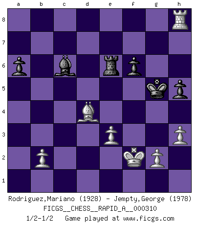 Last move : 1/2-1/2 2025 August 13 21:58:10 [Event "FICGS__CHESS__RAPID_A__000310"] [Site "FICGS"] [Date "2025.06.25"] [Round "1"] [White "Rodriguez,Mariano"] [Black "Jempty,George"] [Result "1/2-1/2"] [WhiteElo "1928"] [BlackElo "1978"] 1.e4 e5 2.Nf3 Nc6 3.Bb5 a6 4.Ba4 b5 5.Bb3 Na5 6.O-O d6 7.d4 exd4 8.Re1 Nxb3 9.axb3 c5 10.c3 Bb7 11.cxd4 Nf6 12.Nc3 Be7 13.Nh4 b4 14.Ne2 O-O 15.Nf5 Re8 16.Nxe7+ Qxe7 17.Ng3 cxd4 18.Qxd4 d5 19.Nf5 Qd7 20.Bh6 Rxe4 21.Rxe4 dxe4 22.Qxd7 Nxd7 23.Bxg7 Nc5 24.Bf6 Nxb3 25.Rd1 Nc5 26.Nd6 e3 27.fxe3 Ne4 28.Nxe4 Bxe4 29.Rd4 Re8 30.Rxb4 h5 31.Rb6 Re6 32.Rb8+ Kh7 33.Bd4 f6 34.Kf1 Kg7 35.Bc3 Kf7 36.Rh8 Kg6 37.Kf2 Kg5 38.h3 Bc6 39.Bd4 1/2-1/2 Follow this game move after move (download)I have added these principles to the law: get the Knights into action before both Bishops are developed. (Emanuel Lasker) Im Schach gewinnt jeder. Hat man Freunde am Spiel - und das ist die Hauptsache - ist auch der Verlust einer Partie kein Unglück. (David Bronstein) Existen dos clases de sacrificios: los correctos y los míos. (Mikhail Tal) Vous savez, camarade Pachman, je n'éprouve pas de plaisir à être ministre, je jouerais plutôt aux échecs comme vous, ou alors ferais une révolution au Venezuela. (Che Guevara à Ludek Pachman, 'Checkmate in Prague', 1975) When I took office, only high energy physicists had ever heard of what is called the World Wide Web... Now even my cat has its own page. (Bill Clinton, 1996)