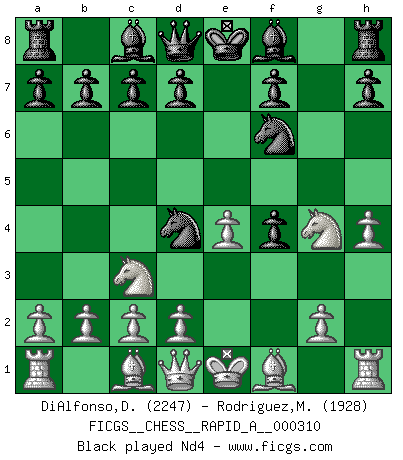 Last move : 1/2-1/2 2025 August 23 19:32:49 [Event "FICGS__CHESS__RAPID_A__000310"] [Site "FICGS"] [Date "2025.06.25"] [Round "1"] [White "DiAlfonso,Darren"] [Black "Rodriguez,Mariano"] [Result "1/2-1/2"] [WhiteElo "2247"] [BlackElo "1928"] 1.e4 e5 2.f4 exf4 3.Nf3 g5 4.h4 g4 5.Ne5 Nf6 6.Nxg4 Nc6 7.Nc3 Nd4 8.Nxf6+ Qxf6 9.d3 c6 10.Ne2 Ne6 11.Qd2 d5 12.exd5 cxd5 13.Nxf4 Bh6 14.g3 Nxf4 15.gxf4 O-O 16.Rg1+ Kh8 17.Qf2 Re8+ 18.Kd1 Bg7 19.c3 d4 20.Bd2 Qb6 21.Kc2 Bf5 22.c4 Qc5 23.Kd1 b5 24.Qg2 Bf6 25.Qd5 Qc8 26.Rc1 Bg4+ 27.Kc2 bxc4 28.Qxf7 Qa6 29.Rxg4 c3 30.Qc4 Qd6 31.Re1 cxd2 32.Rxe8+ Rxe8 33.Bh3 Rb8 34.b4 Qf8 35.a3 a5 36.Rg2 axb4 37.axb4 Rxb4 38.Rg8+ Qxg8 39.Qxb4 Qa2+ 40.Kd1 Qa1+ 41.Kxd2 Qc3+ 42.Qxc3 dxc3+ 43.Kc2 Kg7 44.h5 Kf7 45.Bf5 1/2-1/2 Follow this game move after move (download)Only sissies Castle. (Rob Sillars) Du weisst es gibt ein Problem mit Computern und Fernschach, wenn jeder eine Rating von 2450 hat. (John Christen Knudsen) Aquel que teme a un Peón de Reina aislado, debería de retirarse del Ajedrez. (Siegbert Tarrasch) Si le désir cupide (et stupide) de gagner est une inépuisable source de souffrance, une combinaison brillante sur l'échiquier est une découverte : le coquelicot qui s'épanouit lorsque apparaît la Voie Lactée. (Arrabal) Nobody is always a winner, and anybody who says he is, is either a liar or doesn't play poker. (Amarillo Slim)