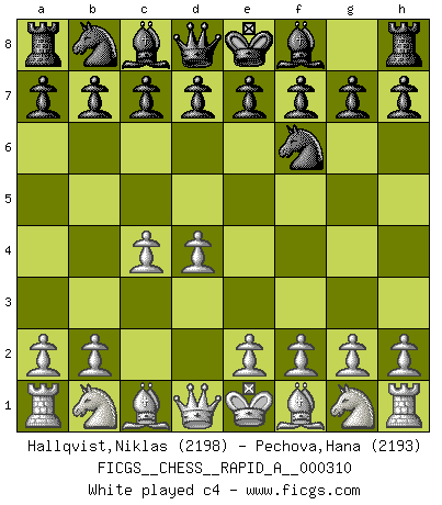 Last move : 1-0 2025 August 26 10:13:11 [Event "FICGS__CHESS__RAPID_A__000310"] [Site "FICGS"] [Date "2025.06.25"] [Round "1"] [White "Hallqvist,Niklas"] [Black "Pechova,Hana"] [Result "1-0"] [WhiteElo "2198"] [BlackElo "2193"] 1.d4 Nf6 2.c4 e6 3.g3 d5 4.Bg2 Bb4+ 5.Bd2 Be7 6.Nf3 O-O 7.Qc2 c6 8.O-O Nbd7 9.Rc1 a5 10.a3 h6 11.Bf4 a4 12.Rd1 Ra6 13.Nbd2 g5 14.Be3 Ng4 15.Nf1 Nxe3 16.Nxe3 Kg7 17.Rac1 f6 18.Qc3 Bd6 19.Nc2 Ra8 20.Nb4 1-0 Follow this game move after move (download)Robert Fischer is a law unto himself. (Larry Evans) Ich suche im Schach immer etwas Eigenes. Riskantes Spiel im Stile schachlicher Musketiere ist nicht meine Sache, auch wenn es vielen Freunden scharfer Wendungen gefällt. (Anatoly Karpov) Buenas posiciones no logran ganar juegos, buenas movidas sí. (Gerald Abrahams) La victoire dans une partie d'Echecs appartient la plupart du temps à celui qui voit un peu plus loin que l'adversaire. (Lasker) Luck has a peculiar habit of favoring those who don't depend on it. (Author unknown)