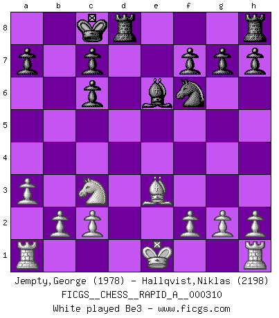 Last move : 1/2-1/2 2025 July 6 0:12:54 [Event "FICGS__CHESS__RAPID_A__000310"] [Site "FICGS"] [Date "2025.06.25"] [Round "1"] [White "Jempty,George"] [Black "Hallqvist,Niklas"] [Result "1/2-1/2"] [WhiteElo "1978"] [BlackElo "2198"] 1.e4 e6 2.d4 d5 3.Nc3 Bb4 4.Nge2 dxe4 5.a3 Bxc3+ 6.Nxc3 Nc6 7.d5 exd5 8.Qxd5 Be6 9.Qxe4 Nf6 10.Qa4 Qd4 11.Bb5 Qxa4 12.Bxa4 O-O-O 13.Bxc6 bxc6 14.Be3 a5 15.O-O Nd5 16.Nxd5 Rxd5 17.Rfd1 Rhd8 18.Rxd5 Rxd5 19.Kf1 a4 20.Ke2 c5 21.Rd1 1/2-1/2 Follow this game move after move (download)I like the moment when I break a man's ego. (Bobby Fischer) Ich habe Putins Aufstieg an die Macht beobachtet und seine Politik, die demokratischen Institutionen meines Landes zu zerstören. (Garry Kasparov) Los finales de Peón son del Ajedrez lo que el cesped es del Golf. (Cecil Purdy) Le jeu d'échecs fait naître et fortifie en nous plusieurs qualités précieuses dans le cours de l'existence, telles que la prévoyance, la circonspection, la prudence, et la persévérance. (Benjamin Franklin - 1783, la morale des échecs) The best weapon against an enemy is another enemy. (Friedrich Nietzsche)