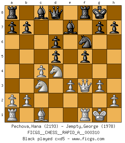 Last move : 0-1 2025 August 21 0:37:12 [Event "FICGS__CHESS__RAPID_A__000310"] [Site "FICGS"] [Date "2025.06.25"] [Round "1"] [White "Pechova,Hana"] [Black "Jempty,George"] [Result "0-1"] [WhiteElo "2193"] [BlackElo "1978"] 1.c4 e5 2.Nc3 d6 3.g3 f5 4.Bg2 Be7 5.d4 Nf6 6.e3 c6 7.Nge2 O-O 8.O-O e4 9.d5 Nbd7 10.Nd4 Ne5 11.f4 exf3 12.Bxf3 Nxf3+ 13.Qxf3 cxd5 14.Nxd5 Ne4 15.Qg2 h5 0-1 This chess game has been lost on time (started : 2025.06.25 0:19:59) Follow this game move after move (download)Chess is war over the board. The object is to crush the opponents mind. (Bobby Fischer) Rubinstein ist ein Turmendspiel, welches die Götter vor tausenden von Jahren begannen. (Savielly Grigorievitsch Tartakower) No hay un Gran Maestro de Ajedrez que sea normal; solo se diferencían ellos por la magnitud de su locura. (Viktor Korchnoi) A ce moment-là, je menaçais de comprendre la position ! (Clément L'Heureux) Dave, my mind is going. I can feel it. (HAL 9000 in 2001, a space odyssey)