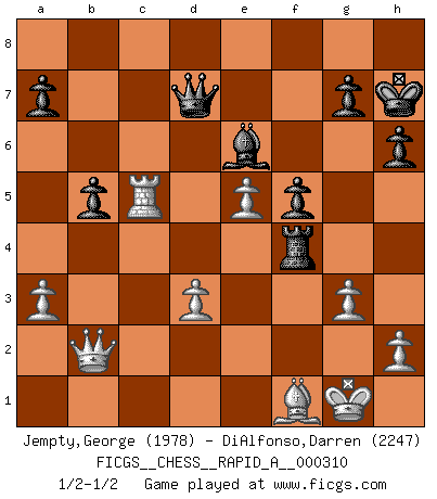 Last move : 1/2-1/2 2025 July 1 2:2:49 [Event "FICGS__CHESS__RAPID_A__000310"] [Site "FICGS"] [Date "2025.06.25"] [Round "1"] [White "Jempty,George"] [Black "DiAlfonso,Darren"] [Result "1/2-1/2"] [WhiteElo "1978"] [BlackElo "2247"] 1.e4 e5 2.Nc3 Nf6 3.f4 d5 4.fxe5 Nxe4 5.Nf3 Be7 6.Bd3 f5 7.O-O O-O 8.Be2 Be6 9.Kh1 c5 10.d3 Nxc3 11.bxc3 d4 12.Bb2 Nc6 13.cxd4 Nxd4 14.Nxd4 cxd4 15.Rf4 Bc5 16.Qg1 Qg5 17.Qf2 Rad8 18.Bf1 h6 19.Re1 Kh7 20.Bxd4 Rxd4 21.Rxd4 Rd8 22.c3 b5 23.a3 Rd5 24.Qb2 Bxd4 25.cxd4 Qd8 26.Rc1 Qd7 27.Kg1 Rxd4 28.Rc5 Rf4 29.g3 1/2-1/2 Follow this game move after move (download)Life is like a game of Chess, changing with each move. (Chinese proverb) Computer sind die einzigen Gegner, die nicht immer eine Ausrede auf Lager haben, wenn sie gegen mich verlieren. (Robert James Fischer) El Ajedrez es imaginación. (David Bronstein) Même si vous avez un bon coup à faire, regardez toujours s'il n'y en a pas un qui lui soit préférable. (Pedro Damiano) Success without honor is an unseasoned dish; it will satisfy your hunger, but it won't taste good. (Joe Paterno)