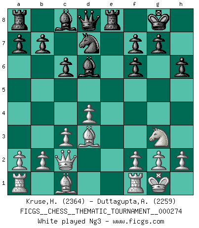 Last move : 1/2-1/2 2025 August 4 21:50:16 [Event "FICGS__CHESS__THEMATIC_TOURNAMENT__000274"] [Site "FICGS"] [Date "2025.06.28"] [Round "1"] [White "Kruse,Herbert"] [Black "Duttagupta,Aniruddha"] [Result "1/2-1/2"] [WhiteElo "2364"] [BlackElo "2259"] 1.e4 c6 2.d4 d5 3.Nc3 dxe4 4.Nxe4 Nf6 5.Nxf6+ exf6 6.c3 Bd6 7.Bd3 O-O 8.Qc2 Re8+ 9.Ne2 h6 10.O-O Nd7 11.Ng3 Nb6 12.Bd2 Be6 13.b3 Nd5 14.Rae1 a5 15.a4 Qc7 16.Be4 Rad8 17.c4 Nb4 18.Qc3 Bxg3 19.hxg3 Qd7 20.f3 Qxd4+ 21.Qxd4 1/2-1/2 Follow this game move after move (download)Via the squares on the chessboard, the Indians explain the movement of time and the age, the higher influences which control the world and the ties which link Chess with the human soul. (Al-Masudi) Ein Teil des Fehlers ist immer korrekt. (Savielly Grigorievitsch Tartakower) Dejen al perfeccionista jugar por correo. (Yasser Seirawan) Seul un grand joueur sait à quel point il joue faiblement. (Xavier Tartacover) I just play for fun. (Anna Kournikova)