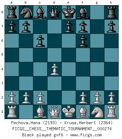 Last move : 1-0 2025 September 12 23:37:49 [Event "FICGS__CHESS__THEMATIC_TOURNAMENT__000274"] [Site "FICGS"] [Date "2025.06.28"] [Round "1"] [White "Pechova,Hana"] [Black "Kruse,Herbert"] [Result "1-0"] [WhiteElo "2193"] [BlackElo "2364"] 1.e4 c6 2.d4 d5 3.Nc3 dxe4 4.Nxe4 Nf6 5.Nxf6+ gxf6 6.c3 Bf5 7.Nf3 Nd7 8.g3 Bg7 9.Bg2 Nf8 10.h4 h5 11.O-O 1-0 Follow this game move after move (download)Nowadays, when you're not a grandmaster at 14, you can forget about it. (Anand Viswanathan) Es war undenkbar für die Behörden, dass ein sowjetischer Großmeister auf diese Art und Weise [Fischer-Taimanov 6:0] verliert, ohne dass es eine politischer Erklärung dafür gäbe. (Mark Taimanov) Me gusta decir que Bobby Fischer fue el mejor jugador que jamás haya existido. Pero lo que hizo de Fischer un genio, fue su habilidad de mezclar una frescura y pragmatismo Americano con ideas Rusas acerca de la estrategia. (Bruce Pandolfini) Ne tendez aucun piège pour le plaisir ! Ne jouez rien dans l'espoir que l'adversaire réagisse de façon stupide ! Prenez toujours pour acquis que l'adversaire va trouver le meilleur coup ! Ne jouez jamais de coup dans l'espoir que l'adversaire ne voie pas la menace ! Chacun de vos coups doit améliorer la position d'une façon ou d'une autre. Perfection is achieved, not when there is nothing more to add, but when there is nothing left to take away. (Antoine de Saint-Exupéry)
