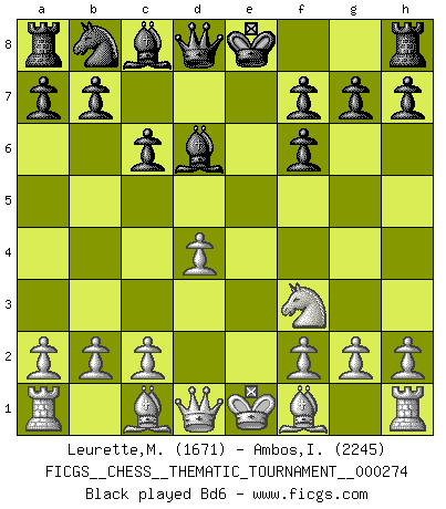 Last move : 0-1 2025 July 12 20:50:39 [Event "FICGS__CHESS__THEMATIC_TOURNAMENT__000274"] [Site "FICGS"] [Date "2025.06.28"] [Round "1"] [White "Leurette,Marc-Antoine"] [Black "Ambos,Ilmar"] [Result "0-1"] [WhiteElo "1671"] [BlackElo "2245"] 1.e4 c6 2.d4 d5 3.Nc3 dxe4 4.Nxe4 Nf6 5.Nxf6+ exf6 6.Nf3 Bd6 7.Be2 O-O 8.O-O Re8 9.c3 Nd7 10.Bd3 Nf8 11.Be3 Bg4 12.h3 Bh5 13.Re1 Bc7 14.Be2 Qd6 15.g3 Rxe3 16.Nh4 Rxg3+ 17.Ng2 Rxg2+ 0-1 Follow this game move after move (download)Chess is a sea in which a gnat may drink and an elephant may bathe. (Hindu proverb) Das Spiel gibt uns die Genugtuung, die das Leben uns versagt. (Emanuel Lasker) Las ideas audaces son como las piezas del Ajedrez que avanzan hacia adelante. Ellas pueden ser vencidas, pero también pueden iniciar una partida victoriosa. (Goethe) Psychologiquement, tu dois avoir confiance en toi même, mais cette confiance doit être basée sur des faits. (Robert Fischer) The quality of decision is like the well-timed swoop of a falcon which enables it to strike and destroy its victim. (Sun Tzu)