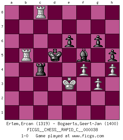 Last move : 1-0 2007 October 21 17:36:0 [Event "FICGS__CHESS__RAPID_C__000038"] [Site "FICGS"] [Date "2007.10.03"] [Round "1"] [White "Ertem,Ercan"] [Black "Bogaerts,Geert-Jan"] [Result "1-0"] [WhiteElo "1319"] [BlackElo "1400"] 1.e4 c5 2.Nf3 Nc6 3.d4 cxd4 4.Nxd4 Nf6 5.f3 g6 6.Nc3 Bg7 7.Bc4 O-O 8.O-O Nxd4 9.Qxd4 d6 10.Qe3 Qa5 11.Bd2 Qb4 12.b3 Qc5 13.Qxc5 dxc5 14.e5 Nd7 15.f4 Nb6 16.Be3 Nxc4 17.bxc4 b6 18.a4 e6 19.Ne4 Ba6 20.Nd6 Rfd8 21.Bf2 Bf8 22.Bh4 Rd7 23.Rad1 Be7 24.Bxe7 Rxe7 25.a5 Kg7 26.axb6 axb6 27.Rb1 Rb8 28.Rf3 f6 29.exf6+ Kxf6 30.Re3 Rd7 31.Ne4+ Ke7 32.Nxc5 bxc5 33.Rxb8 Bxc4 34.Rc3 Bd5 35.Rxc5 h5 36.h4 Be4 37.g3 Kd6 38.Rc4 Bf5 39.Kf2 Ke7 40.Kf3 Rd1 41.Rc7+ Kd6 42.R7c8 Rc1 43.Rb6+ Kd5 44.c3 Be4+ 45.Ke3 Bf5 46.c4+ Rxc4 47.Rb5+ 1-0 Sicilian defense Kingside Castling by player Black (move 7) Kingside Castling by player White (move 8) Player White won this chess game. Follow this game move after move (download)The most important feature of the Chess position is the activity of the pieces. This is absolutely fundamental in all phases of the game: Opening, Middlegame and especially Endgame. The primary constraint on a piece's activity is the Pawn structure. (Michael Stean) Die unerbitterlichsten Regeln im Schach sind die Ausnahmen. (Savielly Grigorievitsch Tartakower) Nada excita más a Grandes Maestros aburridos que una novedad teórica. (Dominic Lawson) Botvinnik disait en comparant les échecs à la musique: Il existe une science dont le but est l'étude de l'acoustique et des sons. Mais il y a aussi un art qui se sert de l'océan des sons : c'est la musique. De toute évidence, il en est de même pour la pensée. La logique est l'étude des lois de la réflexion et les échecs reflètent, en tant qu'art, le côté logique de la réflexion, sous la forme d'images artistiques... Extrait de Fischer - Spassky, Reykjavik 1972 par Alexander & F. Wyndham (Ed. Solar), p 37. Those parts of the system that you can hit with a hammer (not advised) are called hardware; those program instructions that you can only curse at are called software. (Anonymous)