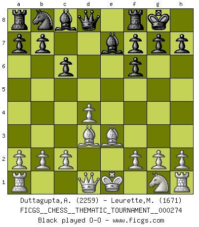 Last move : 1-0 2025 September 5 13:29:29 [Event "FICGS__CHESS__THEMATIC_TOURNAMENT__000274"] [Site "FICGS"] [Date "2025.06.28"] [Round "1"] [White "Duttagupta,Aniruddha"] [Black "Leurette,Marc-Antoine"] [Result "1-0"] [WhiteElo "2259"] [BlackElo "1671"] 1.e4 c6 2.d4 d5 3.Nc3 dxe4 4.Nxe4 Nf6 5.Nxf6+ exf6 6.Be3 Be7 7.Bd3 O-O 8.Ne2 Be6 9.O-O Na6 10.a3 Nc7 11.c4 b6 12.Qc2 c5 13.Bxh7+ Kh8 14.Be4 Rc8 15.Rad1 Qe8 16.d5 Bg4 17.Bf4 Bd8 18.d6 Qe6 19.f3 Bh5 20.d7 Rb8 21.Ng3 Bg6 22.Rfe1 Bxe4 23.Rxe4 Qc6 24.Bxc7 Qxc7 25.Rh4+ 1-0 Follow this game move after move (download)After black's reply to 1.e4 with 1..e5, leaves him always trying to get into the game. (Howard Staunton) Spiel ein langweiliges Spiel zu Ende und lustige Dinge können passieren. (Hans Ree) Si yo gano un torneo, yo lo gano por mí mismo. Yo hago las jugadas. Nadie me ayuda. (Bobby Fischer) On entre au jeu d'Echecs comme on entre en Religion. Pour le joueur d'Echecs, la partie d'Echecs c'est l'office, la messe, le défilé du 1er Mai, le dépôt de gerbe au Monument aux Morts. C'est un drame sacré. (Michel Roos) Vladimir Ras-Putin is still alive... He is also a good actor, I saw him in the Lord of the Rings. (Rodolfo d'Ettorre)