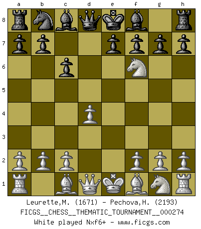 Last move : 0-1 2025 November 10 9:8:2 [Event "FICGS__CHESS__THEMATIC_TOURNAMENT__000274"] [Site "FICGS"] [Date "2025.06.28"] [Round "1"] [White "Leurette,Marc-Antoine"] [Black "Pechova,Hana"] [Result "0-1"] [WhiteElo "1671"] [BlackElo "2193"] 1.e4 c6 2.d4 d5 3.Nc3 dxe4 4.Nxe4 Nf6 5.Nxf6+ gxf6 6.Be3 Bf5 7.Bd3 Bg6 8.Nf3 Nd7 9.Qd2 Bxd3 10.Qxd3 Qa5+ 11.Bd2 Qh5 12.O-O-O O-O-O 13.h3 Nb6 14.g4 Qg6 15.Qa3 Kb8 16.Qb3 h5 17.g5 Qf5 18.gxf6 exf6 19.Qd3 Qxd3 20.Bf4+ Bd6 21.Bxd6+ Rxd6 22.c3 Qxf3 0-1 Follow this game move after move (download)All I want to do, ever, is just play Chess. (Bobby Fischer) Fischer ist das größte Genie, das je vom Schachhimmel heruntergestiegen ist. (Mikhail Nekhemyevich Tal) El Ajedrez expande y enriquece tu mente. (Saudin Robovic) En blitz, le Cavalier l'emporte sur le Fou. (Vlastimil Hort) All the troubles of the world come from being unable to sit alone in a quiet room. (Blaise Pascal)
