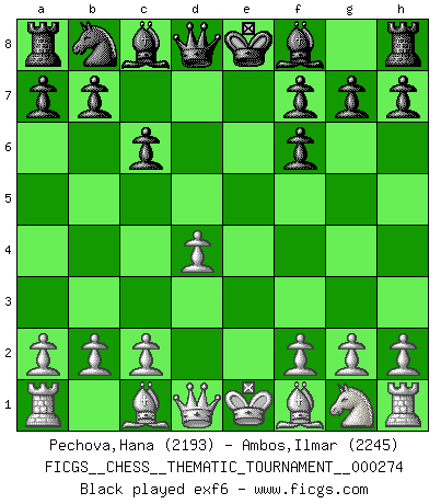 Last move : 0-1 2025 September 24 0:57:18 [Event "FICGS__CHESS__THEMATIC_TOURNAMENT__000274"] [Site "FICGS"] [Date "2025.06.28"] [Round "1"] [White "Pechova,Hana"] [Black "Ambos,Ilmar"] [Result "0-1"] [WhiteElo "2193"] [BlackElo "2245"] 1.e4 c6 2.d4 d5 3.Nc3 dxe4 4.Nxe4 Nf6 5.Nxf6+ exf6 6.c3 Bd6 7.Bd3 O-O 8.Qc2 h6 9.Ne2 Re8 10.O-O Nd7 11.Bf4 Nf8 12.Bxd6 Qxd6 13.Rfe1 Be6 14.Ng3 b6 15.b4 g6 16.h4 h5 17.Ne4 Qe7 18.Qd2 Kg7 19.c4 Rad8 0-1 This chess game has been lost on time (started : 2025.06.28 2:19:55) Follow this game move after move (download)When you don't know what to do, wait for your opponent to get an idea - it's sure to be wrong. (Tarrasch) Ich glaube, ich kenne inzwischen die Gründe für mein Versagen: schachliche Charakterfehler. Ich war nie ein Wunderkind und in meiner gesamten menschlichen Entwicklung immer zu langsam. (Viktor Kortschnoi) El Ajedrez es de 30 a 40 por ciento psicología. Uno no cuenta con esto cuando se juega contra una computadora. No lo puedo confundir. (Judith Polgar) Shah mat. Le roi est mort. Cri de fierté d'un joueur venant de terrasser son adversaire, courtoisement, sans effusion de sang. No, no, you're not thinking; you're just being logical. (Niels Bohr)
