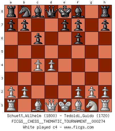 Last move : 1-0 2025 October 8 11:6:20 [Event "FICGS__CHESS__THEMATIC_TOURNAMENT__000274"] [Site "FICGS"] [Date "2025.06.28"] [Round "1"] [White "Schuett,Wilhelm"] [Black "Tedoldi,Guido"] [Result "1-0"] [WhiteElo "1800"] [BlackElo "1720"] 1.e4 c6 2.d4 d5 3.Nc3 dxe4 4.Nxe4 Nf6 5.Nxf6+ gxf6 6.c4 Nd7 7.Nf3 Rg8 8.Bd2 e6 9.g3 Bg7 10.Bg2 f5 11.O-O a5 12.Re1 h6 13.d5 Nc5 14.dxe6 fxe6 15.Ne5 Bxe5 16.Rxe5 Nd3 17.Qh5+ Ke7 18.Re2 Qf8 19.Qxh6 Qxh6 20.Bxh6 Rg6 21.Be3 Bd7 22.Rd1 Ne5 23.Bc5+ Kf6 24.Bd4 Kf7 25.Bxe5 Rd8 26.Bc7 Rdg8 27.Rxd7+ Kf6 28.Bxa5 f4 29.Rxb7 fxg3 30.Bc3+ 1-0 Follow this game move after move (download)Morphy was probably the greatest genius of them all. (Bobby Fischer) Das Schachspiel übertrifft alle anderen Spiele so weit wie der Chimborasso einen Misthaufen. (Arthur Schopenhauer) Un sacrificio se refuta mucho mejor al aceptarlo. (Wilhelm Steinitz) Avec des compensations pour le matériel en plus... (Anonyme) A bird doesn't sing because it has an answer, it sings because it has a song. (Maya Angelou)