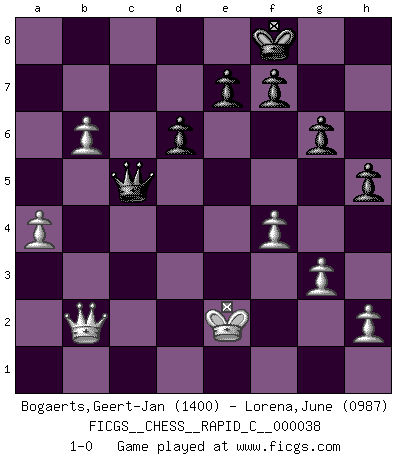 Last move : 1-0 2007 November 10 10:25:18 [Event "FICGS__CHESS__RAPID_C__000038"] [Site "FICGS"] [Date "2007.10.03"] [Round "1"] [White "Bogaerts,Geert-Jan"] [Black "Lorena,June"] [Result "1-0"] [WhiteElo "1400"] [BlackElo "0987"] 1.e4 c5 2.Nf3 Nc6 3.d4 Nf6 4.d5 Nd4 5.Nxd4 cxd4 6.Qxd4 g6 7.Bb5 Bg7 8.Nc3 O-O 9.O-O Ng4 10.Qd3 d6 11.Bf4 a6 12.Ba4 Ne5 13.Qe2 b5 14.Bb3 b4 15.Nd1 a5 16.Re1 Ba6 17.Qd2 Nc4 18.Bxc4 Bxc4 19.c3 bxc3 20.Nxc3 Qb6 21.b3 Ba6 22.Be3 Qb4 23.Rac1 Rac8 24.Na4 Qxe4 25.Bb6 Qh4 26.Bxa5 Be5 27.g3 Qh3 28.f4 Bf6 29.Bc3 Bxc3 30.Rxc3 Qf5 31.Rec1 h5 32.Rxc8 Rxc8 33.Rxc8+ Bxc8 34.Nb6 Ba6 35.b4 Qe4 36.a4 Kf8 37.b5 Bb7 38.Qf2 Bxd5 39.Nxd5 Qxd5 40.Qc2 Kg7 41.Qb2+ Kf8 42.b6 Qc5+ 43.Kg2 Qd5+ 44.Kf2 Qc5+ 45.Ke2 1-0 Sicilian defense Kingside Castling by player Black (move 8) Kingside Castling by player White (move 9) Player White won this chess game. Follow this game move after move (download)The hallmark of the artist is simplicity. (Larry Evans) Ja, jede Frau in Holland liebt mich bestimmt, und alle Männer hassen mich. (Loek van Wely) Después de una mala apertura, hay una esperanza en el juego medio. Pero una vez que estas en finales, el momento de la verdad ha llegado. (Edmar Mednis) Je fais ceci parce que dans cinquante coups j'obtiendrai cela; je m'appelle Mikhail Moisevitch Botvinnik. (Botvinnik) Knowledge will give you power, but character respect. (Bruce Lee)