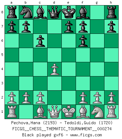 Last move : 0-1 2025 October 6 14:29:49 [Event "FICGS__CHESS__THEMATIC_TOURNAMENT__000274"] [Site "FICGS"] [Date "2025.06.28"] [Round "1"] [White "Pechova,Hana"] [Black "Tedoldi,Guido"] [Result "0-1"] [WhiteElo "2193"] [BlackElo "1720"] 1.e4 c6 2.d4 d5 3.Nc3 dxe4 4.Nxe4 Nf6 5.Nxf6+ gxf6 6.Nf3 Bg4 7.Be2 e6 8.O-O Nd7 9.c4 Qc7 10.Nh4 Bxe2 11.Qxe2 O-O-O 12.g3 Rg8 13.Qh5 Rg7 14.Bh6 Rg5 15.Bxg5 fxg5 16.Qxg5 h6 17.Qh5 Nf6 0-1 This chess game has been lost on time (started : 2025.06.28 2:19:55) Follow this game move after move (download)He who fears an isolated Queen's Pawn should give up Chess. (Siegbert Tarrasch) Das Zentrum ist der Balkan des Schachbretts - Kriegshandlungen können in jedem Moment ausbrechen. (Aaron Nimzowitsch) El Ajedrez moderno está demasiado preocupado con cosas como la estructura de Peones. Olvidenlo, el Jaque Mate termina la partida. (Nigel Short) Vous m'avez demandé de vous exposer quel est le fondement de la prière. Je ne fais que préparer les pièces du jeu sur la table... Nous sera-t-il permis d'en adopter les règles et si nous les appliquons scrupuleusement nous ne tarderons pas à faire mat le Roi divin ! Il ne pourra échapper à nos mains. (Sainte Thérèse d'Avila, Chemin de perfection) Do not put your faith in what statistics say until you have carefully considered what they do not say. (William W. Watt)