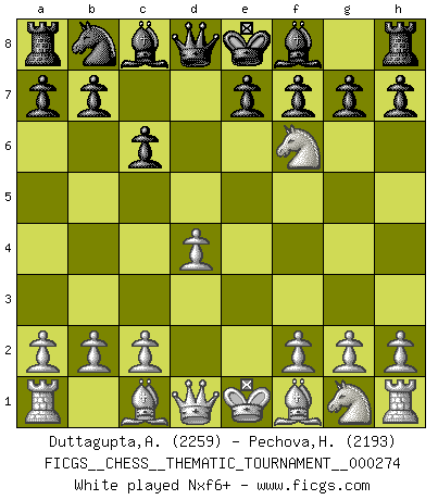 Last move : 1/2-1/2 2025 August 18 17:4:42 [Event "FICGS__CHESS__THEMATIC_TOURNAMENT__000274"] [Site "FICGS"] [Date "2025.06.28"] [Round "1"] [White "Duttagupta,Aniruddha"] [Black "Pechova,Hana"] [Result "1/2-1/2"] [WhiteElo "2259"] [BlackElo "2193"] 1.e4 c6 2.d4 d5 3.Nc3 dxe4 4.Nxe4 Nf6 5.Nxf6+ exf6 6.c3 Bd6 7.Bd3 O-O 8.Qc2 Re8+ 9.Ne2 h5 10.O-O 1/2-1/2 Follow this game move after move (download)Chess is a terrific way for kids to build self image and self esteem. (Saudin Robovic) Wer mein Gambit spielt, muß bereit sein, alle Brücken hinter sich abzubrechen. Es verändert den ganzen Menschen. Es wirkt wie ein Zauberstab und fördert verkümmerte, gute Charakter- eigenschaften wieder zu Tage. (Emil Joseph Diemer) La batalla por la última verdad nunca sera ganada. Y es por eso que el Ajedrez es tan fascinante. (Hans Kmoch) Demandez au pauvre Cg1 ce qu'il en pense. Eduard Gufeld à propos de la variante Saemisch de l'Est-Indienne. As the days dwindle down... to a precious few. (Maxwell Anderson)