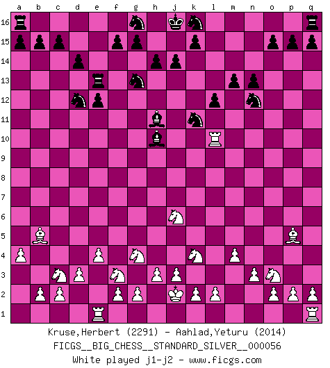 Last move : 1-0 2025 November 8 1:3:25 [Event "FICGS__BIG_CHESS__STANDARD_SILVER__000056"] [Site "FICGS"] [Date "2025.06.29"] [Round "2"] [White "Kruse,Herbert"] [Black "Aahlad,Yeturu"] [Result "1-0"] [WhiteElo "2291"] [BlackElo "2014"] 1.j2-k4 p16-o14 2.h1-o7 h15-g13 3.m2-m4 m15-m13 4.l1-p5 b16-c14 5.e2-e4 j15-k13 6.p1-o3 l16-p12 7.b1-c3 e15-e13 8.f1-b5 h16-m12 9.d2-d3 p12-m9 10.o7-o12 n15-n13 11.o12-m12 k13-m12 12.c1-l9 o16-h10 13.n2-n3 f16-b12 14.g1-j2 d15-d14 15.o1-f9 m12-k11 16.l9-j11 b12-f8 17.j11-h10 f8-h10 18.m1-m3 l15-l13 19.m3-l3 l13-l12 20.h2-g4 m16-m14 21.k1-h2 m14-k14 22.f9-j6 m9-j6 23.k4-j6 c16-h11 24.a2-a4 c14-d12 25.j2-k4 o14-n12 26.e1-e3 k14-k12 27.e3-f3 k12-f12 28.a1-e1 f12-f3 29.h2-f3 e13-e12 30.l3-l10 e16-e13 31.j1-j2 e13-c13 32.l10-p10 p15-p13 33.q1-m1 q15-q13 34.m1-m3 q16-q14 35.m3-l3 h11-b5 36.a4-b5 c13-a13 37.j6-g5 q14-k14 38.l3-l6 k14-k12 39.p10-p6 a16-e16 40.l6-a6 e16-e13 41.e1-a1 a13-a6 42.a1-a6 a15-a14 43.p6-o6 o15-o14 44.p5-o4 g16-f14 45.o4-h10 k11-h10 46.o6-b6 d12-b13 47.c3-d5 g13-f11 48.c2-c4 e13-j13 49.b6-k6 k12-k6 50.a6-k6 j13-j9 51.o3-p5 j9-a9 52.k6-a6 a9-a11 53.a6-a11 b13-a11 54.g4-h6 n12-m10 55.g5-j6 m10-n8 56.p5-n4 f11-e9 57.f3-e5 f14-g12 58.k4-l6 h10-f9 59.k2-k4 f9-d8 60.j6-g7 g12-f10 61.d5-e7 d8-b7 62.b2-b4 b7-d6 63.l6-m8 k15-k13 64.m8-l10 m13-m12 65.l10-k12 a11-c10 66.l2-l4 j16-k15 67.l4-l5 j14-j13 68.k12-h13 k16-j14 69.g7-f9 e12-e11 70.h13-g11 j14-h12 71.g11-e10 g15-g13 72.f2-f4 h12-j10 73.e10-g11 j10-g11 74.f9-g11 k15-j14 75.g2-g4 c10-d12 76.g11-f9 e11-e10 77.f9-h8 d12-f11 78.k4-k5 f11-g9 79.h3-h4 g9-h7 80.g4-g5 h7-k8 81.l5-l6 k8-m9 82.j2-k3 j14-h13 83.k3-l4 h13-h12 84.m4-m5 h12-j11 85.j3-j4 j11-k10 86.k5-k6 k10-j9 87.h6-k7 j9-j8 88.e5-g6 e9-g8 89.e7-g8 f10-g8 90.g6-f8 e10-e9 91.f8-e10 g8-j9 92.e10-g11 j9-k7 93.h8-k7 m9-n7 94.g11-f13 h14-h13 95.f13-h14 n8-o6 96.n4-o6 1-0 Follow this game move after move (download)Pawns: they are the soul of this game, they alone form the attack and defense. (Philidor) Glücklicherweise sind Großmeister Ruben Fines reine Schachbücher weniger phallozentrisch [als seine Schachpsychologie] und deswegen auch weniger lächerlich. (Nigel Short) ¿Que sería del Ajedrez sin errores graciosos?. (Kurt Richter) Le profane ne songe pas à la somme de jouissance dont il se prive, qui méconnaît ce jeu aux ressources aussi variées que passionnantes. (Jean-Marie Jeanton-Lamarche) No man has ever achieved immortality in his own life time. (Unknown)