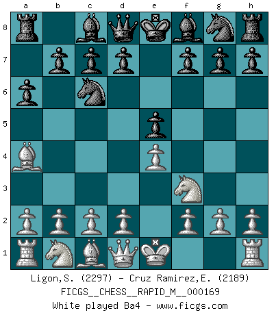 Last move : 1/2-1/2 2025 September 1 21:44:8 [Event "FICGS__CHESS__RAPID_M__000169"] [Site "FICGS"] [Date "2025.07.01"] [Round "1"] [White "Ligon,Scott"] [Black "Cruz Ramirez,Eliecer"] [Result "1/2-1/2"] [WhiteElo "2297"] [BlackElo "2189"] 1.e4 e5 2.Nf3 Nc6 3.Bb5 a6 4.Ba4 Nf6 5.O-O Be7 6.Re1 b5 7.Bb3 O-O 8.c3 d5 9.exd5 Nxd5 10.Nxe5 Nxe5 11.Rxe5 c6 12.Re1 Bd6 13.d3 Bf5 14.Qf3 Re8 15.Rxe8+ Qxe8 16.Nd2 Qe1+ 17.Nf1 Bg6 18.g3 b4 19.c4 Nf6 20.Qxc6 Rd8 21.Qb6 Rd7 22.Bc2 Ng4 23.Rb1 Qe2 24.Bd2 Ne5 25.Qe3 Qh5 26.Bd1 Qf5 27.c5 Bf8 28.Be2 Rxd3 29.Qf4 Rd5 30.Rc1 Rxc5 31.Rxc5 Bxc5 32.Be3 Bd6 33.Qxf5 Bxf5 34.f4 Nd3 35.g4 Be4 36.Nd2 Bxf4 37.Bxf4 Nxf4 38.Bxa6 Bd5 39.a4 bxa3 40.bxa3 Kf8 41.Kf2 Bc6 42.Ke3 Ne6 1/2-1/2 Follow this game move after move (download)The boy (then a 12 year old boy named Anatoly Karpov) doesn't have a clue about Chess, and there's no future at all for him in this profession. (Mikhail Botvinnik) Ich würde mich als ganz normalen Jungen bezeichnen [Im Alter von 12]. (Sergej Karjakin) El Peón aislado arroja penumbra sobre todo el tablero. (Aaron Nimzovich) Les Echecs ont trois composantes : le temps, l'espace et le matériel en dernier. (Mikhail Tal) There's always a bigger fish. (Qui-Gon Jinn in Star Wars ep.1)