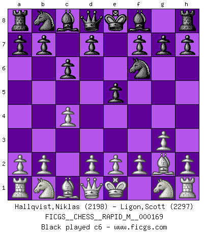 Last move : 0-1 2025 July 28 12:59:31 [Event "FICGS__CHESS__RAPID_M__000169"] [Site "FICGS"] [Date "2025.07.01"] [Round "1"] [White "Hallqvist,Niklas"] [Black "Ligon,Scott"] [Result "0-1"] [WhiteElo "2198"] [BlackElo "2297"] 1.c4 e5 2.g3 Nf6 3.Bg2 c6 4.Nf3 e4 5.Nd4 Qb6 6.Nb3 a5 7.d3 a4 8.N3d2 Bc5 9.O-O e3 10.fxe3 Bxe3+ 11.Kh1 Ng4 12.Ne4 O-O 13.Nbc3 d5 14.cxd5 Bxc1 15.Qxc1 Ne3 16.dxc6 Nxc6 17.Rf4 Nxg2 18.Kxg2 Ne5 19.Qg1 Qe6 20.Qd4 Qh3+ 21.Kh1 Ng4 22.Qg1 b5 23.Qg2 Qh6 24.Nd5 Kh8 25.Nc5 f5 26.Rc1 Ra7 27.Kg1 Raf7 28.h4 Qd6 29.e4 h6 30.e5 Nxe5 31.h5 g5 32.hxg6 Nxg6 33.Rf2 f4 34.Qh1 Kg7 35.Qe4 Rf5 36.Qd4+ Kg8 37.Ne4 Rxd5 38.Nxd6 Rxd4 39.Nxc8 fxg3 40.Rxf8+ Kxf8 41.Rf1+ Rf4 42.Nd6 Rxf1+ 43.Kxf1 h5 44.Nxb5 h4 45.Nd4 Nf4 0-1 Follow this game move after move (download)Chess is not like life... it has rules ! (Mark Pasternak) Um sich vor der Gefahr einer Erkältung zu schützen, sorge der wanderlustige König beizeiten für ein brauchbares Versteck. (Aaron Nimzowitsch) Peones: ellos son el alma de esta partida, solos forman el ataque y la defensa. (Philidor) L'ordinateur a tué l'originalité. Il n'y a plus guère d'aventures sur l'échiquier. (Jacob Murray) Thus, what is of supreme importance in war is to attack the enemy's strategy. (Sun Tzu)