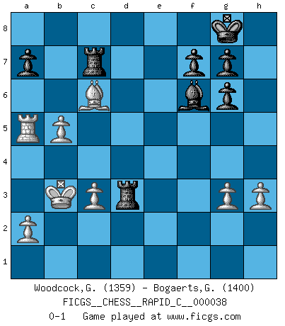 Last move : 0-1 2007 December 13 20:26:41 [Event "FICGS__CHESS__RAPID_C__000038"] [Site "FICGS"] [Date "2007.10.03"] [Round "1"] [White "Woodcock,Graham"] [Black "Bogaerts,Geert-Jan"] [Result "0-1"] [WhiteElo "1359"] [BlackElo "1400"] 1.d4 Nf6 2.d5 c6 3.Nc3 cxd5 4.Nxd5 Qa5+ 5.Nc3 d5 6.Bd2 Bf5 7.Ne4 Qb6 8.Nxf6+ Qxf6 9.c3 Nc6 10.g3 e6 11.Qa4 Bc5 12.e3 O-O 13.Bg2 Ne5 14.Qb5 Nd3+ 15.Ke2 Bg6 16.Nf3 Bb6 17.b4 e5 18.Qxd5 e4 19.Nh4 Qxf2+ 20.Kd1 Rad8 21.Qxb7 Nb2+ 22.Kc2 Qxd2+ 23.Kb3 Nd3 24.Rab1 Qxe3 25.Nxg6 hxg6 26.Bxe4 Rb8 27.Qd5 Rfd8 28.Qc6 Ne5 29.Rbe1 Nxc6 30.Rxe3 Bxe3 31.Bxc6 Rd2 32.Re1 Bg5 33.Re5 Bf6 34.Ra5 Rc8 35.b5 Rc7 36.h3 Rd3 0-1 Queen's pawn game Kingside Castling by player Black (move 12) Player Black won this chess game. Follow this game move after move (download)Chess, like love, like music, has the power to make people happy. (Siegbert Tarrasch) Ich liebe den Moment, wenn ich das Ego meines Gegenüber breche. (Robert James Fischer) Creo que una cierta cantidad de temperamento es esperada de los genios del Ajedrez. (Ron Gross) On entre au jeu d'Echecs comme on entre en Religion. Pour le joueur d'Echecs, la partie d'Echecs c'est l'office, la messe, le défilé du 1er Mai, le dépôt de gerbe au Monument aux Morts. C'est un drame sacré. (Michel Roos) To err is human, but to really foul things up requires a computer. (Farmer's Almanac, 1978)