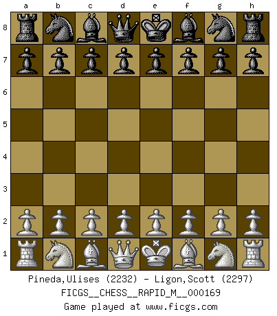 Last move : 1/2-1/2 2025 July 12 6:22:22 [Event "FICGS__CHESS__RAPID_M__000169"] [Site "FICGS"] [Date "2025.07.01"] [Round "1"] [White "Pineda,Ulises"] [Black "Ligon,Scott"] [Result "1/2-1/2"] [WhiteElo "2232"] [BlackElo "2297"] 1.e4 c5 2.Nf3 Nc6 3.Bb5 e6 4.O-O Nge7 5.Re1 a6 6.Bf1 d5 7.d3 d4 8.e5 Ng6 9.c3 Be7 10.Nbd2 b5 11.h4 Nxh4 12.Nxh4 Bxh4 13.a4 bxa4 14.g3 1/2-1/2 Follow this game move after move (download)One of these modest little moves may be more embarrassing to your opponent than the biggest threat. (Siegbert Tarrasch) Ein guter Spieler hat immer Glück. (José Raúl Capablanca) La táctica fluye a partir de una posición superior. (Bobby Fischer) En blitz, le Cavalier l'emporte sur le Fou. (Vlastimil Hort) Inventor: A person who makes an ingenious arrangement of wheels, levers and springs, and believes it civilization. (Ambrose Bierce, The Devil's Dictionary)