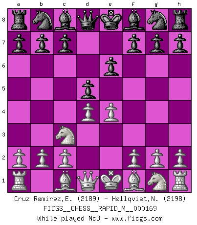 Last move : 1/2-1/2 2025 August 12 16:29:14 [Event "FICGS__CHESS__RAPID_M__000169"] [Site "FICGS"] [Date "2025.07.01"] [Round "1"] [White "Cruz Ramirez,Eliecer"] [Black "Hallqvist,Niklas"] [Result "1/2-1/2"] [WhiteElo "2189"] [BlackElo "2198"] 1.e4 e6 2.d4 d5 3.Nc3 Bb4 4.e5 c5 5.a3 Bxc3+ 6.bxc3 Ne7 7.Qg4 Nf5 8.Bd3 h5 9.Qf4 Qh4 10.Ne2 Qxf4 11.Nxf4 Ne7 12.dxc5 Nd7 13.Bb5 Kf8 14.Nd3 a6 15.Ba4 b5 16.cxb6 Nxb6 17.Bb3 Nf5 18.Rb1 Kg8 19.Ba2 Na4 20.Kd2 Bd7 21.Rb7 Bb5 22.Rc7 Kh7 23.Rxf7 Rhc8 24.Bxd5 exd5 25.Rxf5 Nxc3 26.Rxh5+ Kg8 1/2-1/2 Follow this game move after move (download)I give 98 percent of my mental energy to Chess. Others give only 2 percent. (Bobby Fischer) Was ist der Unterschied zwischen einem Strassenarbeiter und einem Schachspieler? --Der Schachspieler bewegt sich ab und zu. (Anonymous) Una buena memoria, concentración, imaginación y una fuerte voluntad, se requiere para llegar a ser un buen jugador. (Bobby Fischer) Ce n'est pas pour s'amuser qu'il joue aux échecs : il célèbre un culte. (Vladimir Nabokov) Wisdom doesn't necessarily come with age. Sometimes age just shows up all by itself. (Tom Watson)