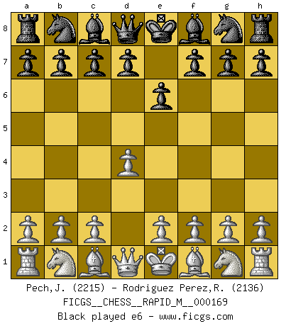 Last move : 0-1 2025 November 7 5:6:10 [Event "FICGS__CHESS__RAPID_M__000169"] [Site "FICGS"] [Date "2025.07.01"] [Round "1"] [White "Pech,Jaroslav"] [Black "Rodriguez Perez,Rene"] [Result "0-1"] [WhiteElo "2215"] [BlackElo "2136"] 1.d4 e6 2.c4 d5 3.Nc3 Nf6 4.Nf3 c6 5.Bg5 h6 6.Bxf6 Qxf6 7.e3 Nd7 8.Bd3 dxc4 9.Bxc4 g6 10.O-O Bg7 11.e4 e5 12.d5 Nb6 13.Bb3 Bg4 14.Rc1 O-O 15.h3 Bxf3 16.Qxf3 Qxf3 17.gxf3 Rfd8 18.Rfd1 Bf8 19.dxc6 bxc6 20.Na4 Rxd1+ 21.Rxd1 Nxa4 22.Bxa4 Rb8 23.Rd2 Kg7 24.Bxc6 Rc8 25.Ba4 Rc7 26.Kg2 Bc5 27.Kf1 Bd4 28.f4 Kf6 29.Bb3 h5 30.Kg2 Rb7 31.h4 Kg7 32.Kg3 exf4+ 0-1 Follow this game move after move (download)I'm not afraid of Spassky. The world knows I'm the best. You don't need a match to prove it. (Bobby Fischer) Ich hatte Angst gegen einen russischen Großmeister zu verlieren, und er befürchtete gegen einen kleinen Jungen zu verlieren. (über ein Remis gegen Juri Awerbach). (Robert James Fischer) El Ajedrez es realmente noventa y nueve por ciento calculación. (Soltis) Assurément je connaissais par expérience le mystérieux attrait de ce jeu royal, le seul entre tous les jeux inventés par les hommes qui échappe souverainement à la tyrannie du hasard, le seul où l'on ne doive sa victoire qu'à son intelligence ou plutôt à une certaine forme d'intelligence. Mais n'est-ce pas déjà le limiter injurieusement que d'appeler les échecs un jeu ? N'est-ce pas une science, un art ou quelque chose qui, comme le cercueil de Mahomet entre ciel et terre, est suspendu entre l'un et l'autre, et qui réunit un nombre incroyable de contraires ? [...] C'est une pensée qui ne mène à rien, une mathématique qui n'établit rien, un art qui ne laisse pas d'uvre, une architecture sans matière; et il l'a prouvé néanmoins qu'il était plus durable, à sa manière, que les livres ou que tout autre monument, ce jeu unique qui appartient à tous les peuples et à tous les temps, et dont personne ne sait quel dieu en fit don à la terre pour tuer l'ennui, pour aiguiser l'esprit et stimuler l'âme. Où commence-t-il, où finit-il ? (Stefan Zweig) Ah, the Socrating method. The best way we have of teaching everything-apart from juggling chainsaws. (Gregory House, House M.D.)