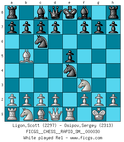 Last move : 1/2-1/2 2025 July 16 15:6:58 [Event "FICGS__CHESS__RAPID_SM__000030"] [Site "FICGS"] [Date "2025.07.04"] [Round "1"] [White "Ligon,Scott"] [Black "Osipov,Sergey"] [Result "1/2-1/2"] [WhiteElo "2297"] [BlackElo "2313"] 1.e4 e5 2.Nf3 Nc6 3.Bb5 Nf6 4.O-O Nxe4 5.Re1 Nd6 6.Nxe5 Be7 7.Bf1 Nxe5 8.Rxe5 O-O 9.Nc3 Bf6 10.Re1 Re8 11.Nd5 Rxe1 12.Qxe1 b6 13.Nxf6+ Qxf6 14.d3 Bb7 15.Qd2 c5 16.c3 h6 17.a4 Re8 18.Qf4 Nf5 19.Bd2 a5 20.h4 Qg6 21.Re1 Rxe1 22.Bxe1 Bd5 23.d4 cxd4 24.Bd2 d6 25.cxd4 Bb7 26.d5 Bxd5 27.Bc3 Bc6 28.Qc4 d5 29.Qf4 d4 30.Bd2 h5 31.f3 Ne3 1/2-1/2 Follow this game move after move (download)On the chessboard, lies and hypocrisy do not survive long. (Emanuel Lasker) Mein Name ist Rustam Kamsky. Sie haben meinen Sohn belästigt. Bereiten Sie sich aufs Sterben vor. (Rustam Kamsky) Yo siempre he tenido un ligero sentimiento de lástima por una persona que no tiene conocimiento del Ajedrez. (Siegbert Tarrasch) En blitz, le Cavalier l'emporte sur le Fou. (Vlastimil Hort) Pushing plastic is for the many, pushing virtual pieces is for the fewer, pushing wood is for the very few. (Normajean Yates)
