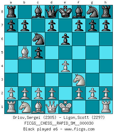 Last move : 1/2-1/2 2025 August 3 7:25:46 [Event "FICGS__CHESS__RAPID_SM__000030"] [Site "FICGS"] [Date "2025.07.04"] [Round "1"] [White "Orlov,Vladimir"] [Black "Ligon,Scott"] [Result "1/2-1/2"] [WhiteElo "2305"] [BlackElo "2297"] 1.e4 c5 2.Nf3 Nc6 3.Bb5 e6 4.O-O Nge7 5.Re1 a6 6.Bf1 d5 7.exd5 Nxd5 8.d4 Nf6 9.Be3 cxd4 10.Nxd4 Bd7 11.c4 Nxd4 12.Bxd4 Bc6 13.Nc3 Be7 14.a3 Qd6 15.b4 Rd8 16.Bb6 Qxd1 17.Nxd1 Rc8 18.Nc3 O-O 19.Red1 h6 20.Be2 Rfe8 21.h4 g6 22.Rac1 Kf8 23.Kf1 Ne4 24.Nxe4 Bxe4 25.h5 gxh5 26.Bxh5 Bg5 27.Rc3 Bd8 28.Bd4 Bg5 29.Bb6 Bd8 1/2-1/2 Follow this game move after move (download)The defensive power of a pinned piece is only imaginary. (Aaron Nimzovich) Garry Kasparov war erst in der Großmeister-Organisation GMA, dann in der Profischach-Vereinigung PCA, zum Schluss kehrte er wieder in den Schoß der FIDE zurück. Aber gut, manche Leute sind flexibel (Viswanathan Anand) De todos mis libros Rusos, la defensa contiene y difunde el 'calor' mas grande que pudiese verse extraño al observar lo supremamente abstracto que el Ajedrez supuestamente es. (Vladimir Nabokov) Les Echecs ne sont pas pour les âmes timides. Ils requièrent un homme entier, qui ne s'arrête pas aveuglément à ce qui a été déjà établi, mais qui tente individuellement de sonder les profondeurs du jeu. (W. Steinitz) I don't believe in psychology. I believe in good moves. (Bobby Fischer)