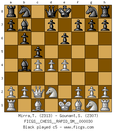 Last move : 1/2-1/2 2025 July 15 3:15:32 [Event "FICGS__CHESS__RAPID_SM__000030"] [Site "FICGS"] [Date "2025.07.04"] [Round "1"] [White "Mirra,Theodore"] [Black "Gounant,Stanislas"] [Result "1/2-1/2"] [WhiteElo "2313"] [BlackElo "2307"] 1.c4 b6 2.d4 e6 3.e4 Bb4+ 4.Nd2 Bb7 5.Qc2 c5 6.d5 f5 7.a3 Ba5 8.b4 cxb4 9.Qb2 bxa3 10.Rxa3 Bxd2+ 11.Bxd2 Nf6 12.Nh3 Nxe4 13.Qxg7 Qf6 14.Qxf6 Nxf6 15.Be2 Na6 16.O-O Nc5 17.Bc3 Ke7 18.Bb2 exd5 19.Nf4 Rhe8 20.Rh3 Ne6 21.Nxe6 dxe6 22.Rh6 Rf8 23.cxd5 Bxd5 24.Ba3+ Kf7 25.Bxf8 Rxf8 26.Rc1 a5 27.Rc7+ Kg8 28.Rh3 Rf7 29.Rg3+ Kf8 30.Rgc3 Rxc7 31.Rxc7 h6 32.Ra7 Ne4 33.Kf1 Nc3 34.Bf3 Bxf3 35.gxf3 a4 36.Rc7 Nd5 37.Rb7 a3 38.Ke1 a2 1/2-1/2 Follow this game move after move (download)Of Chess it has been said that life is not long enough for it, but that is the fault of life, not Chess. (William Ewart Napier) Ich kenne Menschen, die allen Willen der Welt besitzen und doch nicht Schach spielen können. (Robert James Fischer) Aún deseo matar a Fischer. (Boris Spassky) Le succès, c'est être capable d'aller d'échec en échec sans perdre son enthousiasme. (Winston Churchill) Don't be discouraged. It's often the last key in the bunch that opens the lock. (Author unknown)
