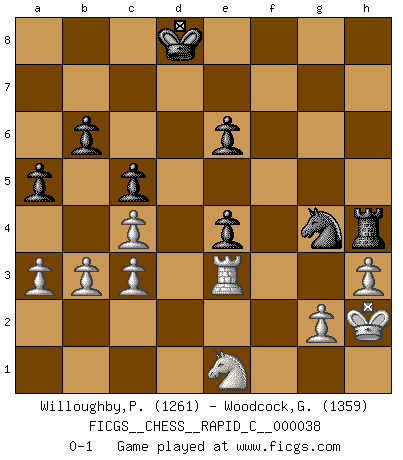 Last move : 0-1 2007 November 7 17:43:14 [Event "FICGS__CHESS__RAPID_C__000038"] [Site "FICGS"] [Date "2007.10.03"] [Round "1"] [White "Willoughby,Peter"] [Black "Woodcock,Graham"] [Result "0-1"] [WhiteElo "1261"] [BlackElo "1359"] 1.e4 e6 2.b3 c5 3.Bb2 Nf6 4.e5 Nd5 5.c4 Ne7 6.Nc3 g6 7.Nf3 Bg7 8.Ne4 b6 9.Nd6+ Kf8 10.Ng5 Qc7 11.Ngxf7 Rg8 12.Ng5 Nf5 13.Nxh7+ Ke7 14.Nxc8+ Qxc8 15.Ng5 Qc7 16.Nf3 d6 17.Rb1 dxe5 18.Bd3 a5 19.O-O Nd7 20.Bc3 Qc6 21.Re1 Qd6 22.Bxf5 gxf5 23.Re3 e4 24.Ne1 Rh8 25.h3 Bxc3 26.dxc3 Ne5 27.Qxd6+ Kxd6 28.Rd1+ Ke7 29.f3 Rh4 30.fxe4 fxe4 31.a3 Rd8 32.Rxd8 Kxd8 33.Kh2 Ng4+ 0-1 French : Reti (Spielmann) variation Kingside Castling by player White (move 19) Player Black won this chess game. Follow this game move after move (download)Though most people love to look at the games of the great attacking masters, some of the most successful players in history have been the quiet positional players. They slowly grind you down by taking away your space, tying up your pieces, and leaving you with virtually nothing to do ! (Yasser Seirawan) Ein Buch ist ein Spiegel; wenn ein Affe hineinsieht, so kann kein Apostel heraus gucken. (Georg Christoph Lichtenberg) Cuando tengo las piezas blancas, yo gano porque soy blanco; Cuando tengo las piezas negras, yo gano porque soy Bogolyubov. (Bogolyubov) Le succès, c'est être capable d'aller d'échec en échec sans perdre son enthousiasme. (Winston Churchill) The difference between perseverance and obstinacy is that one comes from a strong will, and the other from a strong won't. (Henry Ward Beecher)