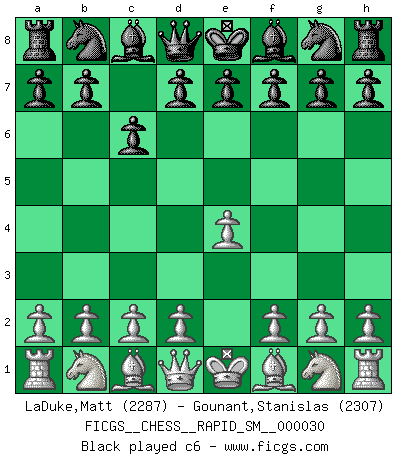 Last move : 1/2-1/2 2025 July 31 3:47:21 [Event "FICGS__CHESS__RAPID_SM__000030"] [Site "FICGS"] [Date "2025.07.04"] [Round "1"] [White "LaDuke,Matt"] [Black "Gounant,Stanislas"] [Result "1/2-1/2"] [WhiteElo "2287"] [BlackElo "2307"] 1.e4 c6 2.d4 d5 3.e5 c5 4.Nf3 cxd4 5.Nxd4 Nc6 6.Nxc6 bxc6 7.Bd3 e6 8.O-O Ne7 9.Nd2 a5 10.Nf3 Ba6 11.Bxa6 Rxa6 12.c4 Ng6 13.Be3 Be7 14.h4 Bxh4 15.Nxh4 Qxh4 16.Bc5 Nxe5 17.Qb3 Nd7 18.Bd6 c5 19.Bxc5 Nxc5 20.Qb5+ Ke7 21.Qxc5+ Kf6 22.cxd5 Qb4 23.Qc7 Rd6 24.a3 Qb6 1/2-1/2 Follow this game move after move (download)A strong memory, concentration, imagination, and a strong will is required to become a great Chess player. (Bobby Fischer) Den Ruhm habe ich schon, jetzt brauche ich noch das Geld. (Wilhelm Steinitz) El Ajedrez es el gimnasio de la mente. (Blaise Pascal) La conception d'un plan est le processus par lequel un joueur exploite les avantages de sa position tout en s'efforçant d'en réduire au minimum les inconvénients. Afin de garantir le succès, un plan doit toujours se fonder sur un diagnostic objectif des particularités d'une position. La conception d'un plan est d'autant plus difficile que la position est équilibrée, et grandement facilitée lorsqu'il n'existe qu'un seul plan susceptible de répondre aux exigences de la position. (Harry Golombek) Establishing goals is all right if you don't let them deprive you of interesting detours. (Doug Larson)