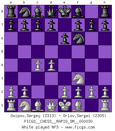 Last move : 1/2-1/2 2025 July 22 21:41:35 [Event "FICGS__CHESS__RAPID_SM__000030"] [Site "FICGS"] [Date "2025.07.04"] [Round "1"] [White "Osipov,Sergey"] [Black "Orlov,Vladimir"] [Result "1/2-1/2"] [WhiteElo "2313"] [BlackElo "2305"] 1.d4 Nf6 2.c4 e6 3.Nf3 d5 4.Nc3 Bb4 5.e3 O-O 6.Bd3 dxc4 7.Bxc4 c5 8.O-O cxd4 9.exd4 b6 10.Bg5 Bb7 11.Qe2 Bxc3 12.bxc3 Nbd7 13.Rfc1 Qc7 14.Nd2 Nd5 15.f3 Rae8 16.Bh4 e5 17.Bg3 Nf4 18.Bxf4 exf4 19.Ne4 1/2-1/2 Follow this game move after move (download)In order to improve your game, you must study the endgame before everything else, for whereas the endings can be studied and mastered by themselves, the middle game and the opening must be studied in relation to the endgame. (Jose Raul Capablanca) Lisa Lane, amerikanische Schachmeisterin, hatte Fischer einmal als stärksten lebenden Spieler bezeichnet. Antwort: Das ist richtig, aber Lisa Lane ist eigentlich nicht in der Lage, das zu beurteilen. (Robert James Fischer) Repentinamente, me resultaba obvio en mi analisis que yo había pasado por alto lo que Fischer había visto en el tablero con la mas grande facilidad. (Mikhail Botvinnik) Un footballeur joue avec ses pieds, parfois avec sa tête. Un joueur d'échecs ne joue qu'avec sa tête. Et quand il ne joue plus, il meurt. (Jacob Murray) A bird doesn't sing because it has an answer, it sings because it has a song. (Maya Angelou)