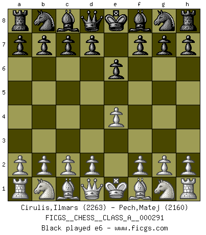 Last move : 1/2-1/2 2026 January 13 3:51:52 [Event "FICGS__CHESS__CLASS_A__000291"] [Site "FICGS"] [Date "2025.07.10"] [Round "1"] [White "Cirulis,Ilmars"] [Black "Pech,Matej"] [Result "1/2-1/2"] [WhiteElo "2263"] [BlackElo "2160"] 1.e4 e6 2.d4 d5 3.e5 c5 4.c3 Nc6 5.Nf3 Qb6 6.a3 Nh6 7.Bd3 cxd4 8.O-O Nf5 9.Re1 Be7 10.b4 Bd7 11.c4 dxc4 12.Bxc4 Qc7 13.Bd3 b5 14.Bf4 Qd8 15.Bxb5 a5 16.g4 Nh4 17.Nxh4 Bxh4 18.Qf3 Rc8 19.Nd2 O-O 20.Ba6 Rb8 21.Bd3 f6 22.Qh3 Nxe5 23.Bxe5 fxe5 24.Nf3 Bb5 25.Bxh7+ Kxh7 26.Nxh4 Be8 27.Rxe5 Kg8 28.Rxe6 Qd5 29.Rae1 Bc6 30.f3 d3 31.Ng6 Qd4+ 32.R1e3 Qa1+ 33.Kf2 Qa2+ 34.Re2 Qxe2+ 35.Rxe2 Rxf3+ 36.Qxf3 Bxf3 37.Re3 1/2-1/2 Follow this game move after move (download)In Chess, as it is played by masters, chance is practically eliminated. (Emanuel Lasker) In Buenos Aires ist es nicht mein vorrangiges Ziel ein starkes Turnier zu organisieren, sondern ein Turnier für Gentlemen. Ich würde nie Kamsky einladen. Ich mag keine Probleme. (Miguel Najdorf) No nos podemos resistir a la fascinación de un sacrificio ya que la pasión por los sacrificios es parte de la naturaleza de un jugador de Ajedrez. (Rudolf Spielman) Comme les marins qui ont mille raisons différentes d'aller en mer, les joueurs d'échecs en ont tout autant avant de s'installer devant une table et jouer... (Vincent Bertignac, philosophe) Wisdom doesn't necessarily come with age. Sometimes age just shows up all by itself. (Tom Wilson)