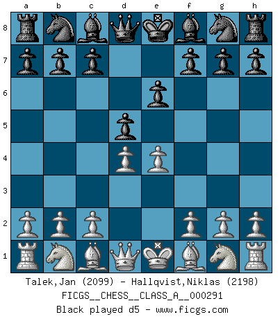 Last move : 1/2-1/2 2025 November 24 23:14:0 [Event "FICGS__CHESS__CLASS_A__000291"] [Site "FICGS"] [Date "2025.07.10"] [Round "1"] [White "Talek,Jan"] [Black "Hallqvist,Niklas"] [Result "1/2-1/2"] [WhiteElo "2099"] [BlackElo "2198"] 1.e4 e6 2.d4 d5 3.Nc3 Bb4 4.e5 c5 5.a3 Bxc3+ 6.bxc3 Ne7 7.Qg4 Nf5 8.Bd3 h5 9.Qf4 Qh4 10.Qxh4 Nxh4 11.Bg5 Ng6 12.a4 Ne7 13.dxc5 Nd7 14.Nf3 Nxc5 15.a5 Bd7 16.Be3 Ne4 17.c4 O-O 18.cxd5 exd5 19.Nd4 Rfc8 20.h3 Nc5 21.Kd2 Ne4+ 22.Ke2 Ng6 23.f4 Ng3+ 24.Kf3 Nxh1 25.Rxh1 b6 26.e6 Be8 27.exf7+ Bxf7 28.axb6 axb6 29.Rb1 Rab8 30.g4 hxg4+ 31.hxg4 Ne7 32.f5 b5 33.Bf4 Rb7 34.Be5 Nc6 35.Nxc6 Rxc6 36.g5 Bh5+ 37.Kf4 b4 38.g6 b3 39.cxb3 Rb4+ 40.Kg5 Bf3 41.Rg1 Rc1 42.Rg3 Be4 43.Be2 Rc2 44.Re3 Rc6 45.Bf4 Rc8 46.Bg4 Re8 47.Bd6 Rb7 48.Kf4 Ra7 49.Bc5 Ra2 50.Re1 Rea8 51.Rg1 Rg2 52.Rd1 Ra5 53.Bd4 Ra3 54.Rc1 Rc2 55.Rd1 Rh2 56.Bc5 Rxb3 57.Ra1 Rb8 58.Ra7 Kh8 59.Bd4 Rg8 60.Rd7 Rd2 61.Be5 Rh2 62.Kg3 Rg2+ 63.Kh4 Rg1 64.Bd4 Rb1 65.Kg5 Rb4 66.Ba1 1/2-1/2 George Jempty I've concluded that the safest way for Black is to play is 3...dxe4 4.Nxe4 Nd7 Follow this game move after move (download)Weak points or holes in the opponent's position must be occupied by pieces not Pawns. (Siegbert Tarrasch) Jeder weiß, dass Gasprom Putins persönliches Machtinstrument ist. Die Firma wird vom Kreml aus geleitet und wird schon deshalb nie transparent sein. (Garry Kasparov) Un jugador que trata de regresar una movida en el Ajedrez es un futuro carterista. (Richard Fenton) Votre seul travail dans les ouvertures est d'obtenir un milieu de partie jouable. (Lajos Portish) There are two major products that came out of Berkeley: LSD and UNIX. We do not believe this is to be a coincidence. (Jeremy S. Anderson)