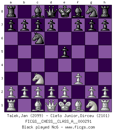Last move : 0-1 2025 September 18 0:43:3 [Event "FICGS__CHESS__CLASS_A__000291"] [Site "FICGS"] [Date "2025.07.10"] [Round "1"] [White "Talek,Jan"] [Black "Cleto Junior,Dirceu"] [Result "0-1"] [WhiteElo "2099"] [BlackElo "2101"] 1.f3 e5 2.Nc3 Nc6 3.e4 Bc5 4.Bc4 d6 5.d3 a5 6.a3 h6 7.Nb5 Nf6 8.Qe2 O-O 9.Be3 b6 10.Qf2 Bxe3 11.Qxe3 Ne7 12.Nc3 c6 13.Ba2 d5 14.Nce2 b5 15.Ng3 Be6 16.N1e2 c5 17.O-O d4 18.Qd2 a4 19.h3 Nd7 20.f4 Qa5 21.Qxa5 Rxa5 22.c3 Bxa2 23.Rxa2 f6 24.R2a1 Rd8 25.fxe5 fxe5 26.Rf2 R5a8 27.Rd1 Rac8 28.Nf5 Nxf5 29.exf5 Kf7 30.g4 Nf6 31.cxd4 cxd4 32.Ng3 Nd5 33.Rfd2 Nf4 34.h4 Nd5 35.Kf2 g6 36.Rg1 Ne3 37.fxg6+ Kxg6 38.Kf3 Rf8+ 39.Ke4 Nxg4 40.Kd5 h5 41.Kd6 Rfd8+ 42.Ke7 Rg8 43.Ke6 Rcd8 44.Nf5 Rgf8 45.Ne7+ Kh7 46.Nd5 Rc8 47.Ne7 Rf6+ 48.Kd7 Ra8 49.Nc6 Ra6 50.Rc2 e4 51.Kc7 exd3 0-1 Follow this game move after move (download)Chess is played with the mind and not with the hands ! (Renaud and Kahn) Stelle das Brett so, daß die Sonne in die Augen deines Gegners scheint. (Ruy López) Todavía soy una víctima del Ajedrez. Tiene toda la belleza del arte y mucho mas. No puede ser comercializado. El Ajedrez es mas puro que el arte en su posición social. (Marcel Duchamp) Aux échecs, les retours au sommet sont rares : les dommages psychologiques consécutifs à une défaite sont trop sévères. (Daily Telegraph) If computers get too powerful, we can organize them into committees. That'll do them in. (Anonymous)
