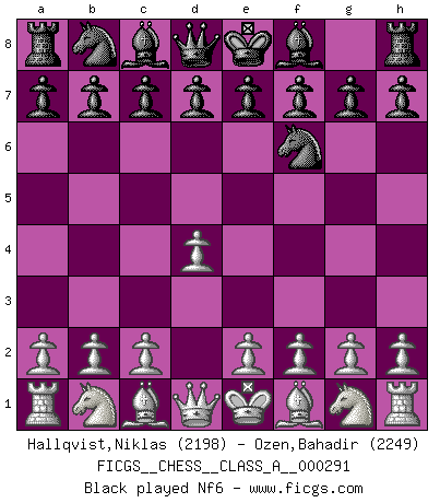 Last move : 1/2-1/2 2025 August 24 18:44:3 [Event "FICGS__CHESS__CLASS_A__000291"] [Site "FICGS"] [Date "2025.07.10"] [Round "1"] [White "Hallqvist,Niklas"] [Black "Ozen,Bahadir"] [Result "1/2-1/2"] [WhiteElo "2198"] [BlackElo "2249"] 1.d4 Nf6 2.c4 e6 3.g3 Bb4+ 4.Bd2 Be7 5.Bg2 d5 6.Nf3 O-O 7.O-O c6 8.Qc2 b6 9.Nc3 Nbd7 10.e4 dxc4 11.e5 Nd5 12.Ne4 h6 13.Qxc4 Bb7 14.Rfe1 c5 15.dxc5 Rc8 16.Rad1 a5 17.a3 Nxc5 18.Nxc5 Bxc5 19.Qg4 f5 20.exf6 Qxf6 1/2-1/2 Follow this game move after move (download)With or without the title, Bobby Fischer was unquestionably the greatest player of his time. (Burt Hochberg) Man braucht nicht immer den besten Zug zu spielen: Ein Zug muß aktiv, unternehmungslustig, korrekt und schön sein. (David Bronstein) Fischer no está bajo la obligación de nadie. (Joseph Platz) Les échecs, c'est la lutte contre l'erreur. (Johannes Zukertort) You cannot beat a roulette table unless you steal money from it. (Albert Einstein)