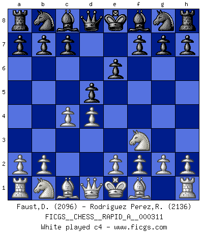Last move : 1/2-1/2 2025 September 11 19:3:1 [Event "FICGS__CHESS__RAPID_A__000311"] [Site "FICGS"] [Date "2025.07.13"] [Round "1"] [White "Faust,Dieter"] [Black "Rodriguez Perez,Rene"] [Result "1/2-1/2"] [WhiteElo "2096"] [BlackElo "2136"] 1.d4 e6 2.Nf3 d5 3.c4 Nf6 4.Bg5 Be7 5.Nc3 O-O 6.Rc1 h6 7.Bxf6 Bxf6 8.e3 c6 9.Bd3 Nd7 10.O-O dxc4 11.Bxc4 e5 12.Ne4 exd4 13.Nxf6+ Nxf6 14.Nxd4 Qe7 15.Qb3 c5 16.Ne2 b6 17.Nf4 Bb7 18.f3 Qc7 19.Rfd1 Bc6 20.Ng6 Rfe8 21.Nh4 Re5 22.Ng6 R5e8 23.Nh4 Re5 24.Ng6 R5e8 1/2-1/2 Follow this game move after move (download)To avoid losing a piece, many a person has lost the game. (Savielly Tartakover) Das Schach hält seine Meister in eigenen Banden, Fesseln; auf vielerlei Weise formt es ihren Geist, so dass die innere Freiheit selbst des Stärksten beeinflusst wird. (Albert Einstein) Aquel que ve no otra dirección en el juego que la de dar Jaque Mate a su oponente, nunca será un buen jugador de Ajedrez. (Euwe) Le plus grand jeu de l'esprit jamais inventé, plus vous l'apprenez, plus vous y prenez du plaisir. (Garry Kasparov) When the going gets tactical, the computers get going. (Hyatt)