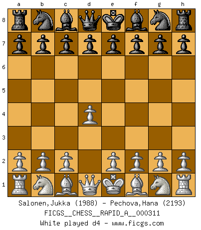 Last move : 1/2-1/2 2025 September 30 6:41:51 [Event "FICGS__CHESS__RAPID_A__000311"] [Site "FICGS"] [Date "2025.07.13"] [Round "1"] [White "Salonen,Jukka"] [Black "Pechova,Hana"] [Result "1/2-1/2"] [WhiteElo "1988"] [BlackElo "2193"] 1.d4 d5 2.c4 e6 3.Nc3 Nf6 4.Nf3 c6 5.e3 Nbd7 6.Bd3 dxc4 7.Bxc4 b5 8.Bd3 a6 9.e4 c5 10.d5 Qc7 11.dxe6 fxe6 12.O-O Bb7 13.Bc2 c4 14.Qe2 Bd6 15.Nd4 Nc5 16.f4 e5 17.Nf5 O-O 18.Rd1 Nd3 19.Nxd6 Qxd6 20.Bxd3 cxd3 21.Rxd3 Qc7 22.fxe5 Qxe5 23.Be3 Rad8 24.Rad1 Rxd3 25.Qxd3 Ng4 26.g3 Qh5 27.Qe2 Re8 28.Rd4 Qg6 29.Bf4 Nf6 30.a4 1/2-1/2 Follow this game move after move (download)Alekhine is a poet who creates a work of art out of something that would hardly inspire another man to send home a picture post card. (Max Euwe) Die starken Figuren des Gegners muss man abtauschen. (José Raúl Capablanca) El Ajedrez, como la música, como el amor, tiene el poder de hacer feliz a la gente. (Siegbert Tarrasch) La tactique est l'élément le plus important du milieu de jeu. (Siegbert Tarrasch) Excelling at chess has long been considered a symbol of more general intelligence. That is an incorrect assumption in my view, as pleasant as it might be. But for the purposes of argument and investigation, chess is, in Russkin-Gutman's words, 'an unparalleled laboratory, since both the learning process and the degree of ability obtained can be objectified and quantified, providing an excellent comparative framework on which to use rigorous analytical techniques.' (The Chess Master and the Computer, by Garry Kasparov - 2010)