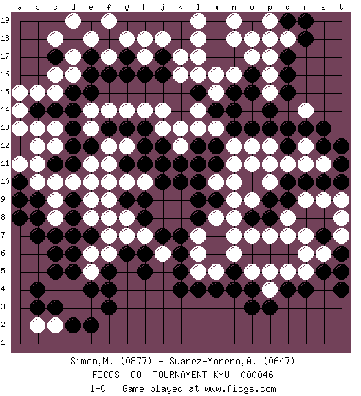 Last move : 1-0 2007 December 22 10:40:42 [Event "FICGS__GO__TOURNAMENT_KYU__000046"] [Site "FICGS"] [Date "2007.10.05"] [Round "1"] [Black "Simon,Mickael"] [White "Suarez-Moreno,Alejandro"] [Result "1-0"] [Rating 1 "0877"] [Rating 2 "0647"] 1.q16 d4 2.q4 d16 3.q10 d10 4.k4 k16 5.k10 p17 6.q17 p16 7.q15 p15 8.p14 o14 9.p13 n10 10.f3 e3 11.f4 n12 12.c6 e5 13.f5 e6 14.c3 c4 15.b4 c2 16.b3 b2 17.d2 d3 18.c5 d7 19.c7 c8 20.b8 b10 21.e2 g7 22.c14 c15 23.d14 n7 24.d8 c9 25.e7 e8 26.d6 f7 27.d7 f6 28.f8 e9 29.h8 g8 30.h9 j6 31.h6 h7 32.j7 f9 33.k7 l5 34.l4 m5 35.m4 q7 36.o3 r5 37.r4 r9 38.r10 p12 39.o13 o12 40.n13 r12 41.q12 q11 42.q13 r11 43.s10 p10 44.m12 m13 45.m14 l13 46.o15 n16 47.n15 m16 48.p18 o18 49.o16 o17 50.l12 m15 51.n14 l14 52.c11 c10 53.j12 c12 54.d12 b11 55.d11 b13 56.b14 b15 57.c17 d17 58.d18 e18 59.e17 c18 60.f18 d19 61.j17 k17 62.j16 f17 63.e16 g18 64.g17 f19 65.f16 h17 66.g16 j18 67.h16 h18 68.h5 r14 69.r13 s9 70.q9 q8 71.p9 o9 72.p8 p7 73.o8 n8 74.s12 s11 75.p11 o11 76.t11 p11 77.s13 o7 78.t10 t9 79.t12 f11 80.g9 g10 81.h11 e13 82.d15 c16 83.d13 g12 84.k5 l7 85.k6 j14 86.h13 h14 87.g13 g14 88.f13 f14 89.e12 e14 90.e15 f12 91.e10 e11 92.d5 a14 93.g6 j13 94.h12 k12 95.e4 f8 96.d9 f10 97.k11 k13 98.s7 r7 99.s5 s6 100.t6 r6 101.t4 o5 102.m9 n9 103.l8 l11 104.m11 m10 105.l10 n11 106.l11 m8 107.l9 l6 108.m18 q18 109.r18 p19 110.n17 n18 111.m17 l17 112.m19 l18 113.l15 l16 114.r19 n19 115.q19 l19 116.n4 p4 117.p3 q5 118.n5 n6 119.b9 a9 120.b7 h10 121.j10 t8 122.a10 a11 123.a8 t7 124.t5 p18 125.o4 p5 126.j11 c13 127.a12 a13 128.g11 e10 129.a10 b12 130.a9 a15 131.pass pass 132.pass pass 133.pass pass 134.pass pass 135.pass 1-0 Here are the names of the openings (joseki) played in the four corners : Corner q16 : q16 p17 Hoshi (Hwajeom, Seongjeom, Xingwei`) 4-4 Point. The star or hoshi (4-4) point, emphasizing influence at the potential expense of territory. Corner d4 : d4 f3 Hoshi (Hwajeom, Seongjeom, Xingwei`) 4-4 Point. The star or hoshi (4-4) point, emphasizing influence at the potential expense of territory. Ikken Kakari (Hankan Keolch'im, Yi Gua`jiao~, 1-Space Low Approach). Black 2 is the standard approach move to the 4-4. Corner d16 : d16 c14 Hoshi (Hwajeom, Seongjeom, Xingwei`) 4-4 Point. The star or hoshi (4-4) point, emphasizing influence at the potential expense of territory. Ikken Kakari (Hankan Keolch'im, Yi Gua`jiao~, 1-Space Low Approach). Black 2 is the standard approach move to the 4-4. Corner q4 : q4 n7 Hoshi (Hwajeom, Seongjeom, Xingwei`) 4-4 Point. The star or hoshi (4-4) point, emphasizing influence at the potential expense of territory. Player Black won this Go (weiqi, baduk) game. Follow this game move after move (download)Ikken tobi is never wrong. (Anonymous) It is a good thing for an uneducated man to read books of quotations. (Winston Churchill)