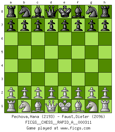 Last move : 0-1 2025 September 4 5:29:19 [Event "FICGS__CHESS__RAPID_A__000311"] [Site "FICGS"] [Date "2025.07.13"] [Round "1"] [White "Pechova,Hana"] [Black "Faust,Dieter"] [Result "0-1"] [WhiteElo "2193"] [BlackElo "2096"] 1.c4 Nf6 2.Nc3 c6 3.d4 d5 4.Nf3 e6 5.e3 Nbd7 6.Qc2 Bd6 7.Bd3 dxc4 8.Bxc4 b5 9.Be2 Bb7 10.O-O O-O 11.Rd1 Qc7 12.e4 e5 13.Bg5 exd4 14.Rxd4 Ne5 0-1 Follow this game move after move (download)I played Chess with him and would have beaten him sometimes only he always took back his last move, and ran the game out differently. (Mark Twain) Im Reiche der Wirklichkeit ist man nie so glücklich wie im Reiche der Gedanken. (Arthur Schopenhauer) Hoy en día, si tu no eres un Gran Maestro a los 14 años, es mejor que lo olvides. (Anand Viswanathan) Le thème de l'attaque double intervient d'une manière ou d'une autre dans l'immense majorité des combinaisons. (Youri Averbakh) Unless in communicating with it one says exactly what one means, trouble is bound to result. (Alan Turing, about computers)